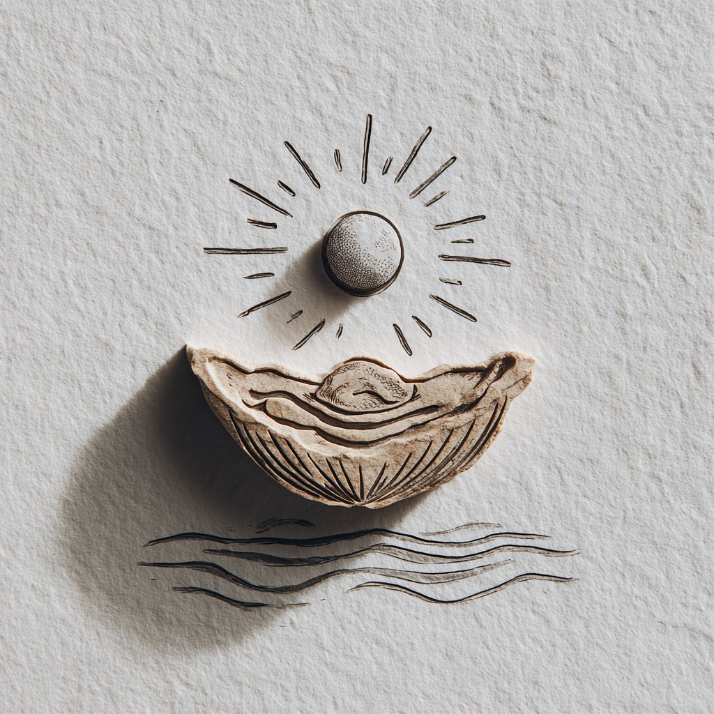 A rough, minimalist stamp depicting an open oyster on a white surface, with a floating pearl above it, with lines of light resembling a sun. --v 7.0