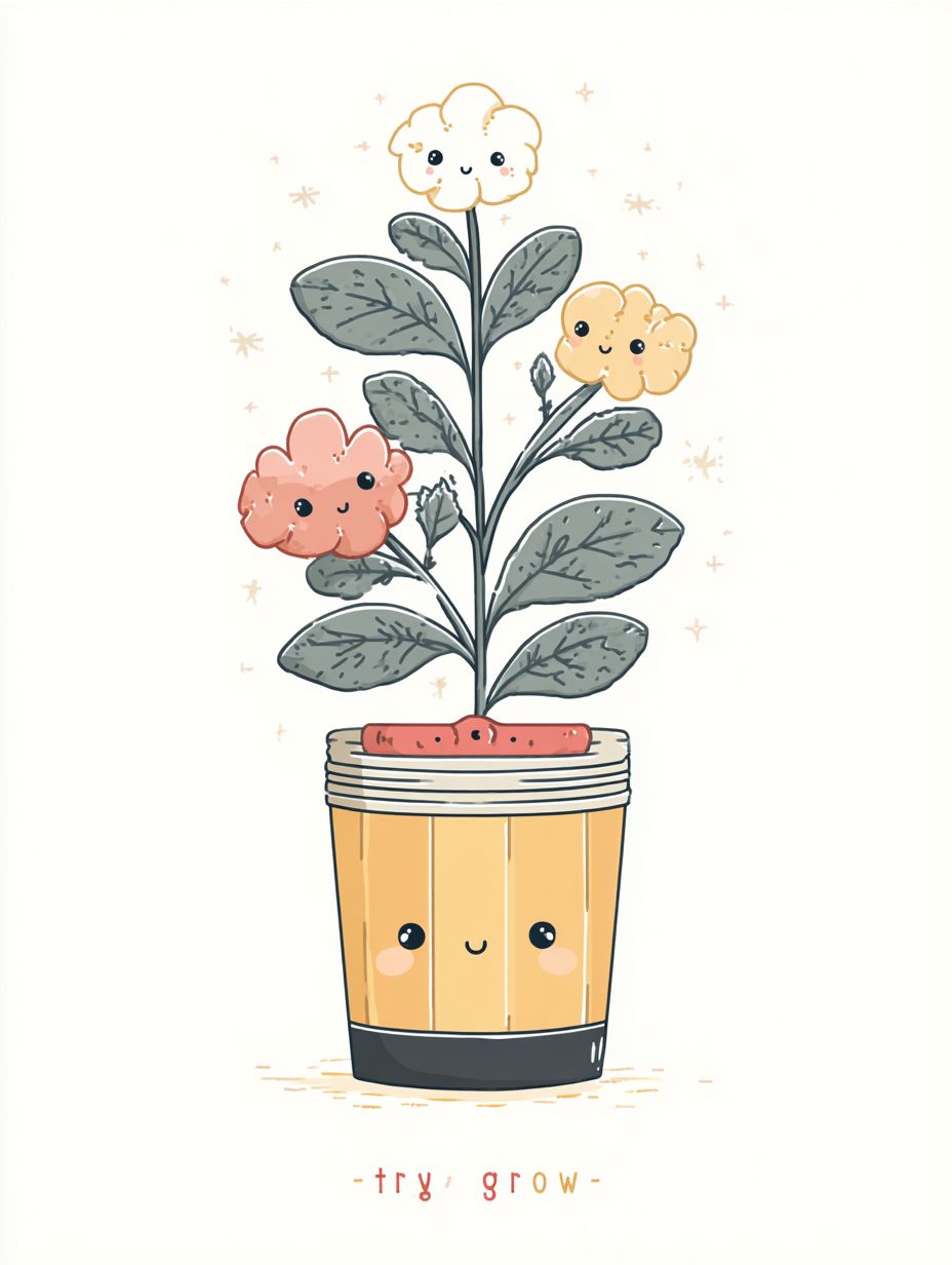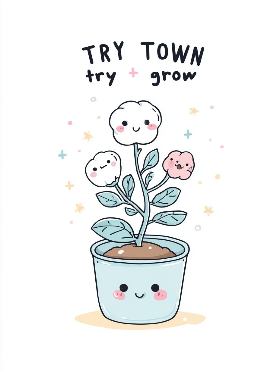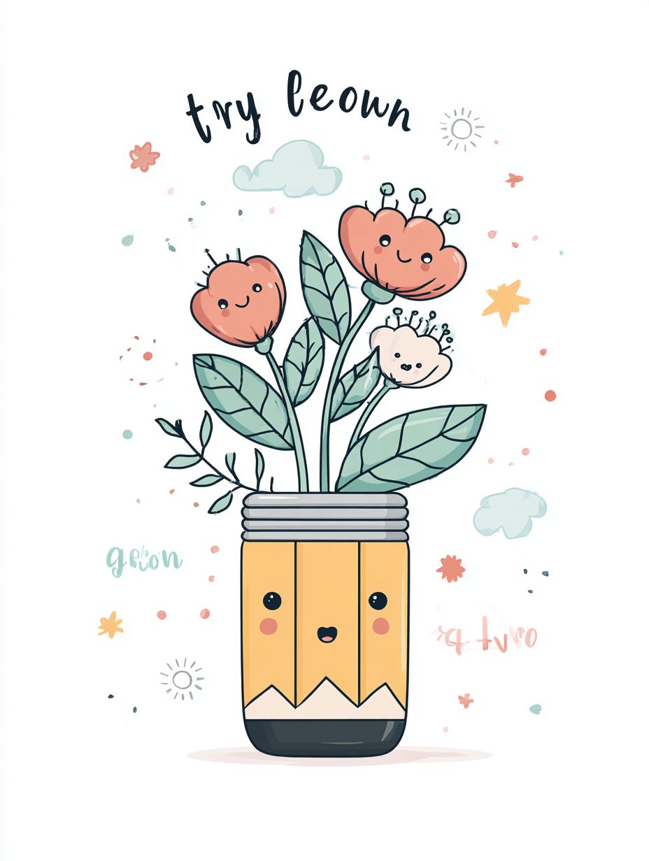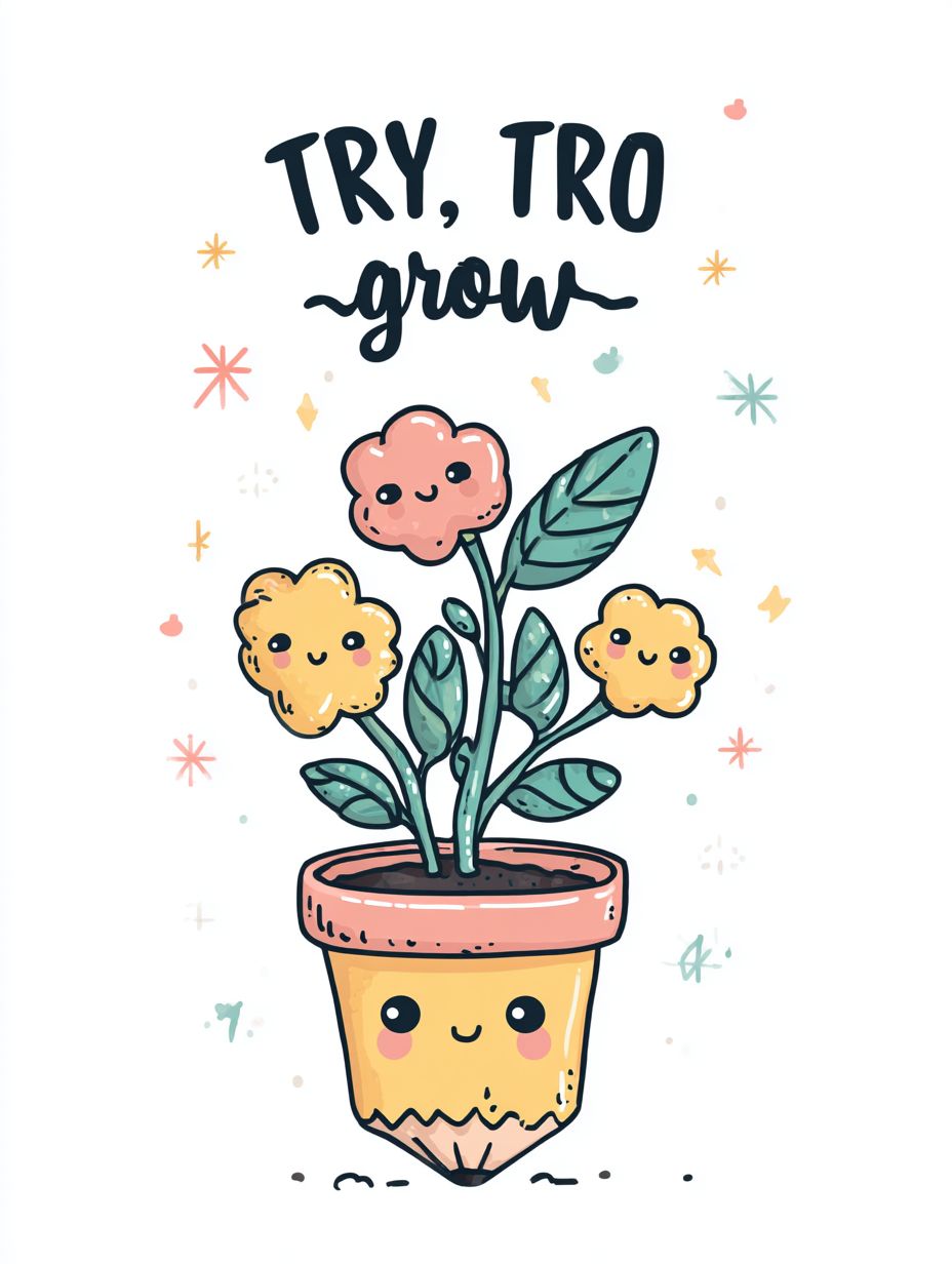 A cute cartoon plant growing from a pencil eraser, with smiling leaves and flowers labeled 'try', 'learn', 'grow', uplifting educational poster style for kids, flat vector illustration, pastel tones, white background, A4 format, minimal text space on top, classroom-friendly style, kawaii faces on objects, bold clean outlines, high-resolution.
