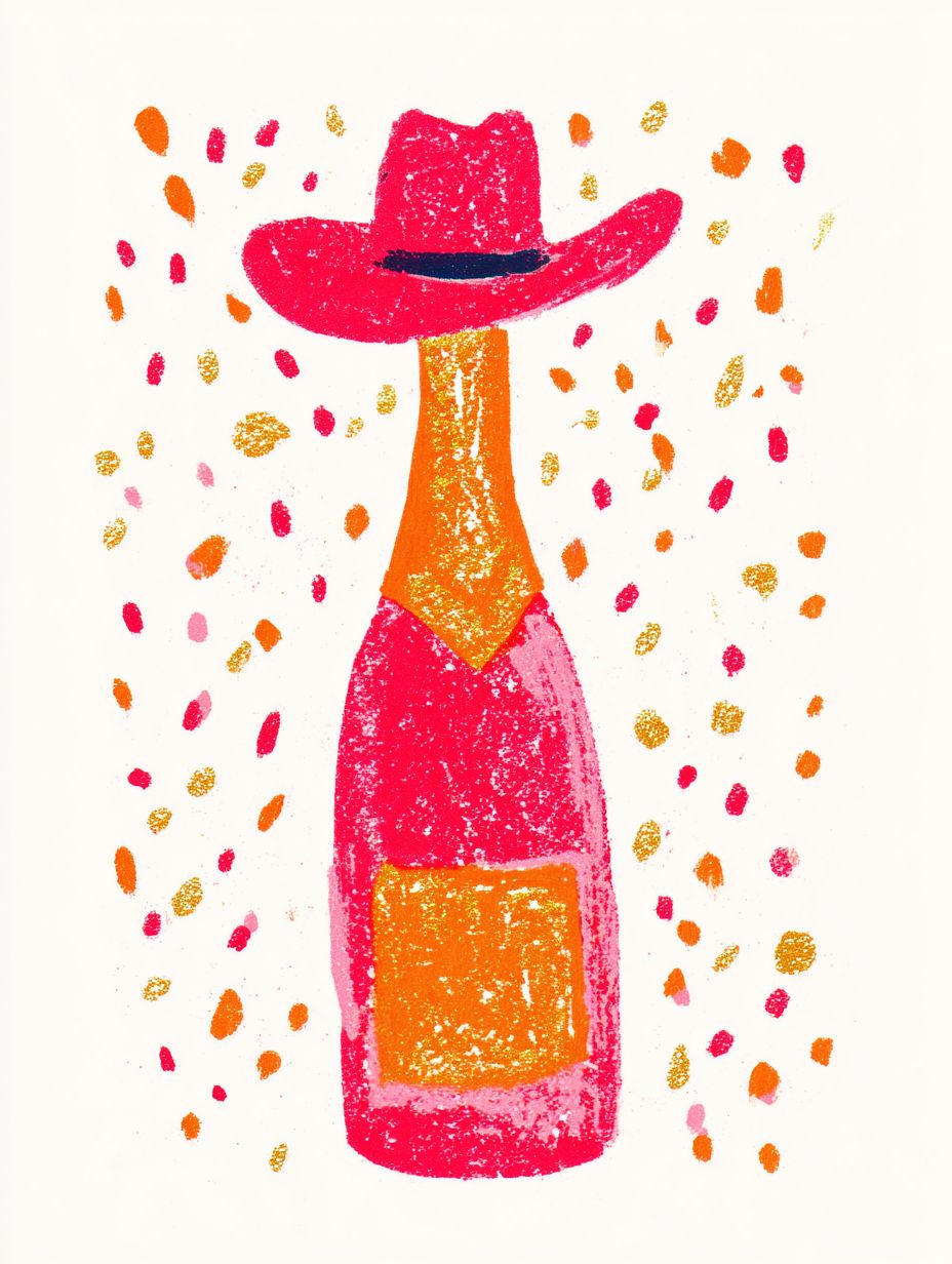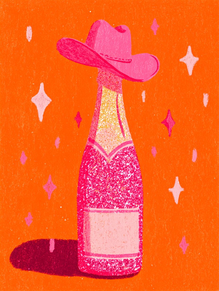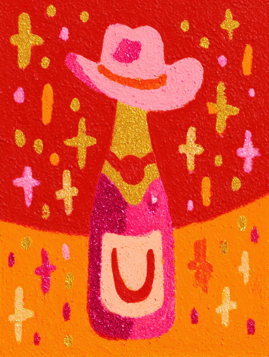 Cute gouache illustration, glitter champagne bottle with a cowboy hat, sparkles all around. Pink, orange, gold, red color scheme.