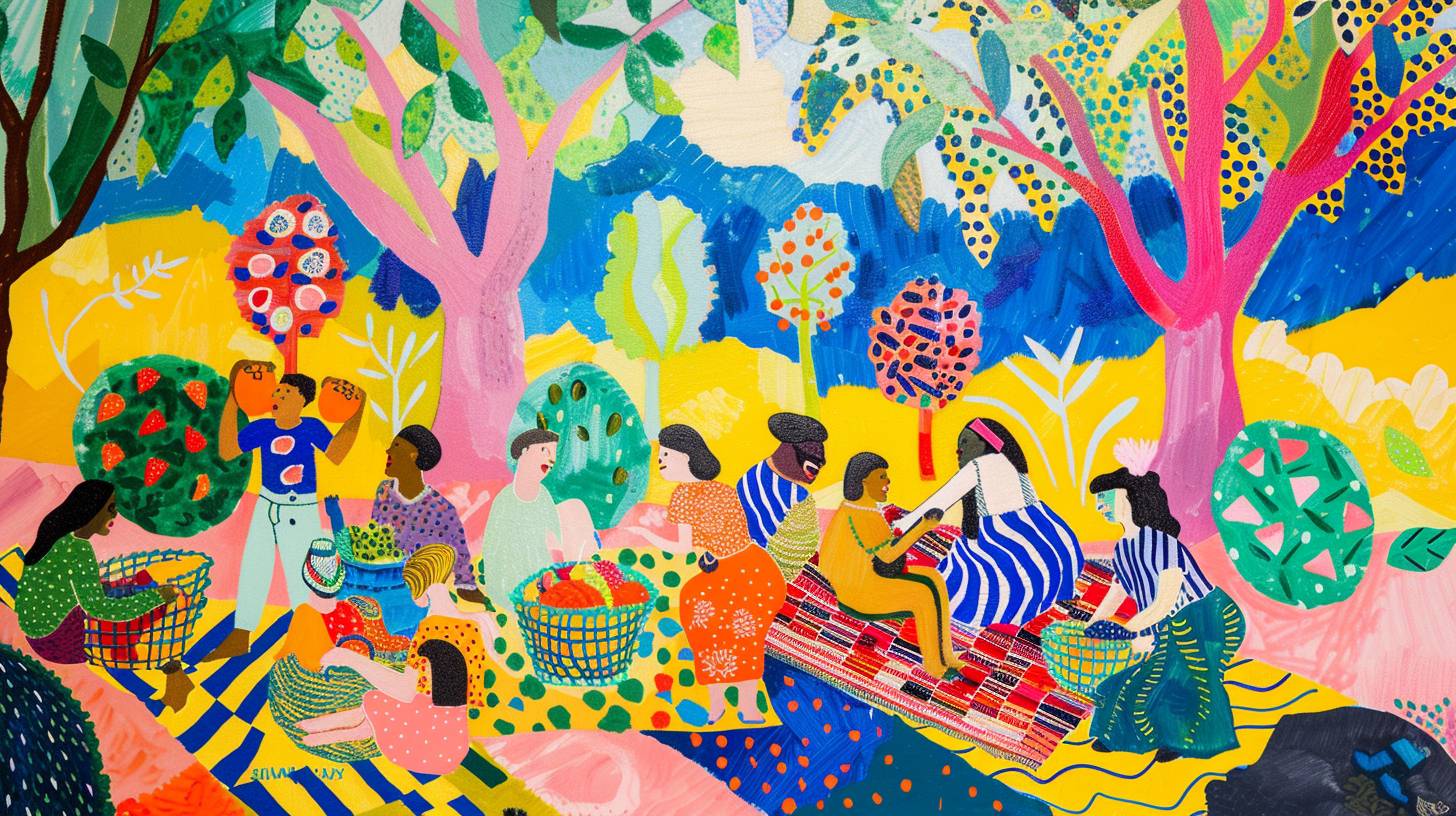 A whimsical and joyful depiction of a summer picnic in a park, using the vibrant colors and playful compositions of Matisse and Hockney. The scene should include picnic blankets, baskets of fruit, and groups of friends laughing and enjoying the sunny day --v 6.0 --ar 16:9 --style raw