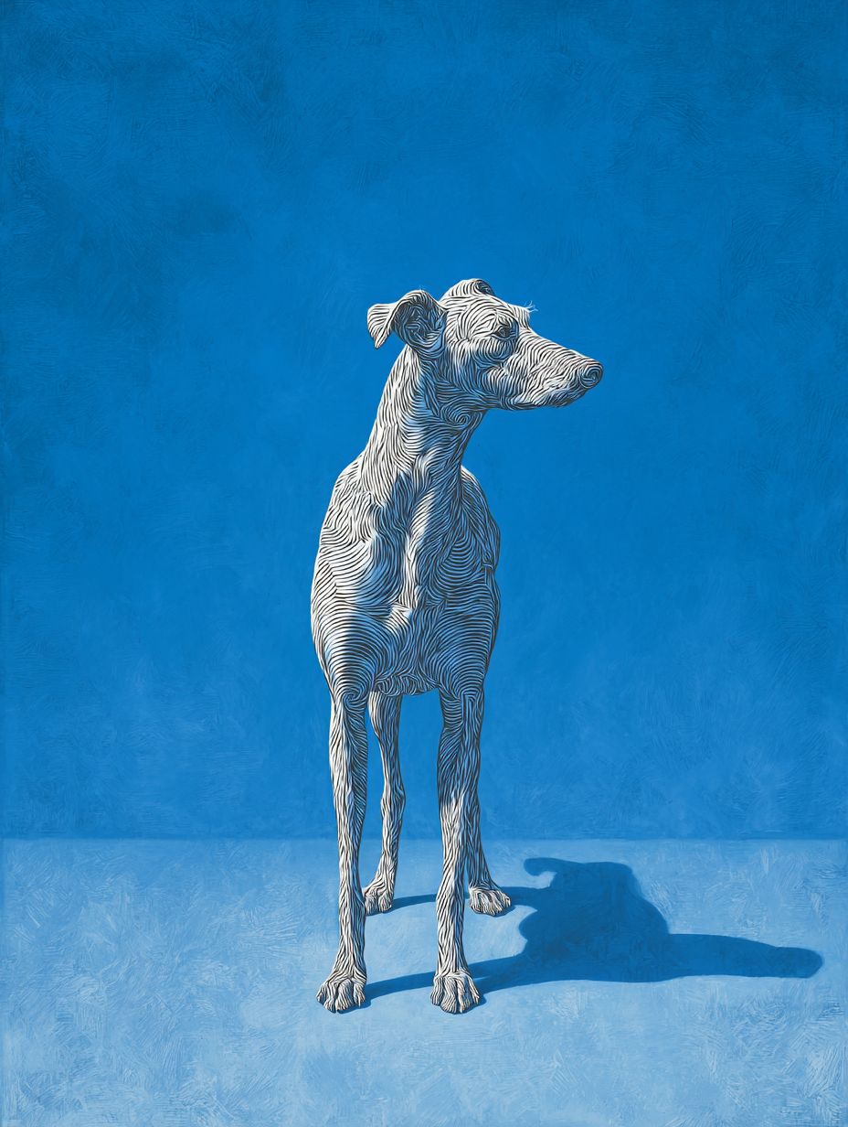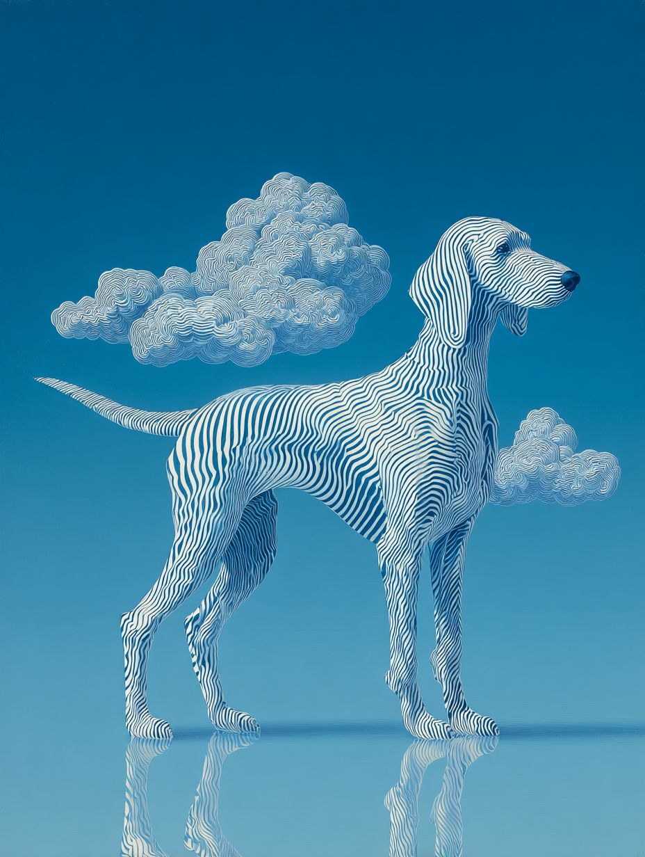 Surreal artwork of a dog in the style of René Magritte, isolated subject, background a dreamy flat blue, crisp clean forms, fine art print aesthetic, a composition with refined balance, the dog should be entirely constructed out of lines.