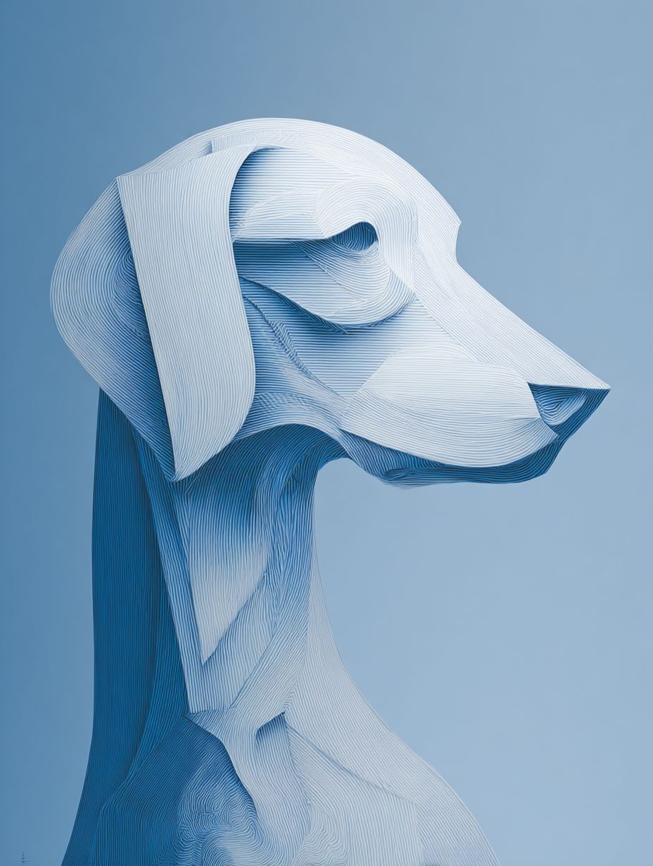 surreal artwork of a dog in the style of René Magritte, isolated subject, background a dreamy flat blue, crisp clean forms, fine art print aesthetic, a composition with refined balance, the dog should be entirely constructed out of lines. --ar 3:4 --v 7.0