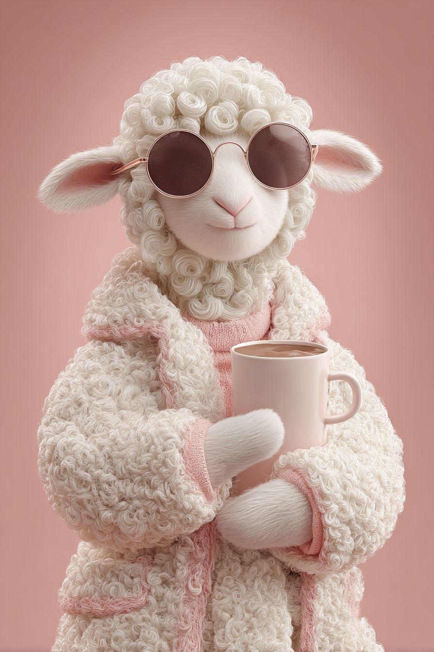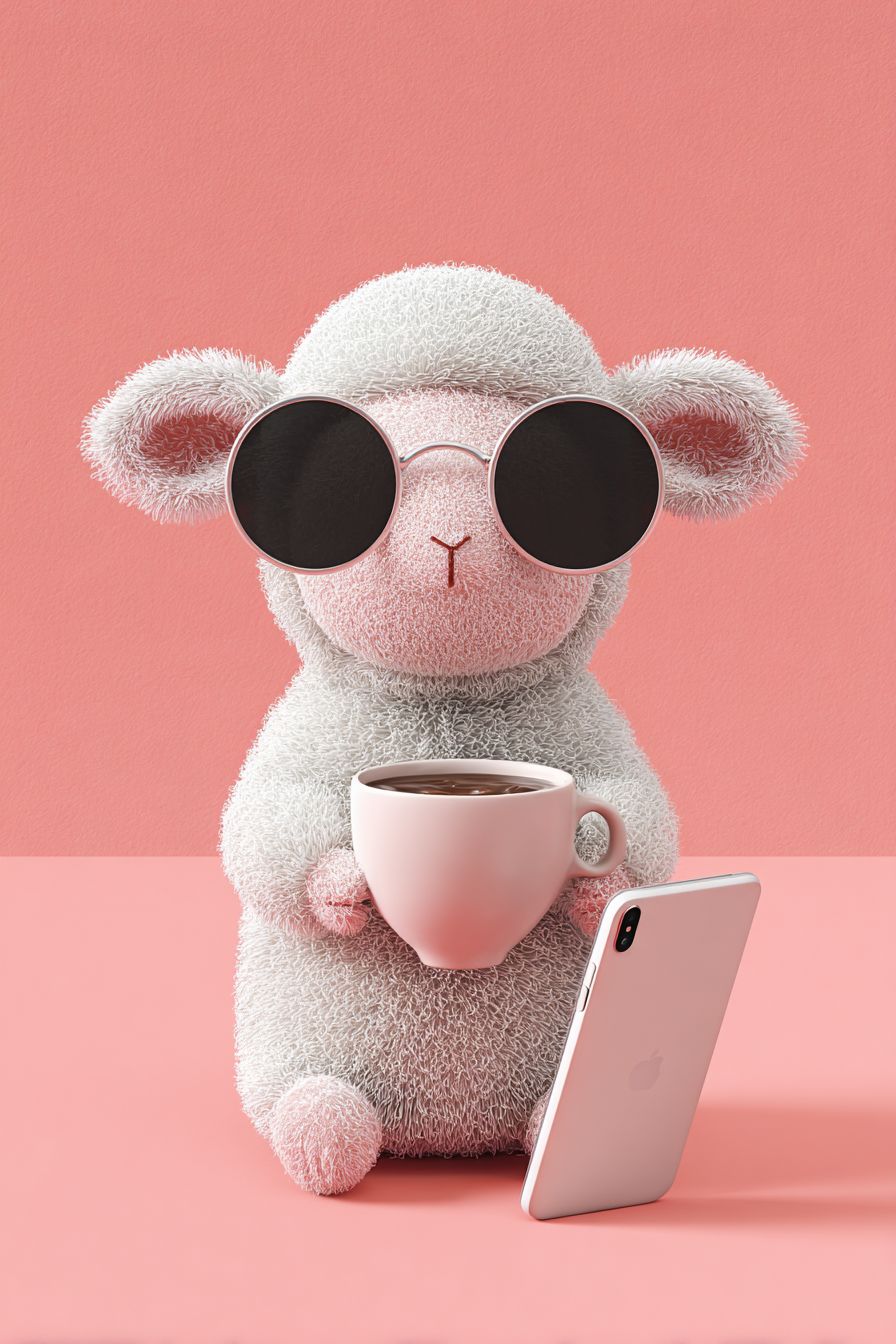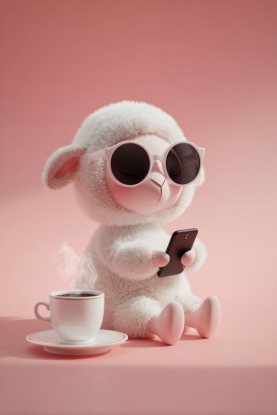 3d lamb minimalist with phone and coffee in a cup on pink background stylish in pinterest style lamb in sunglasses cool --ar 2:3 --v 7.0