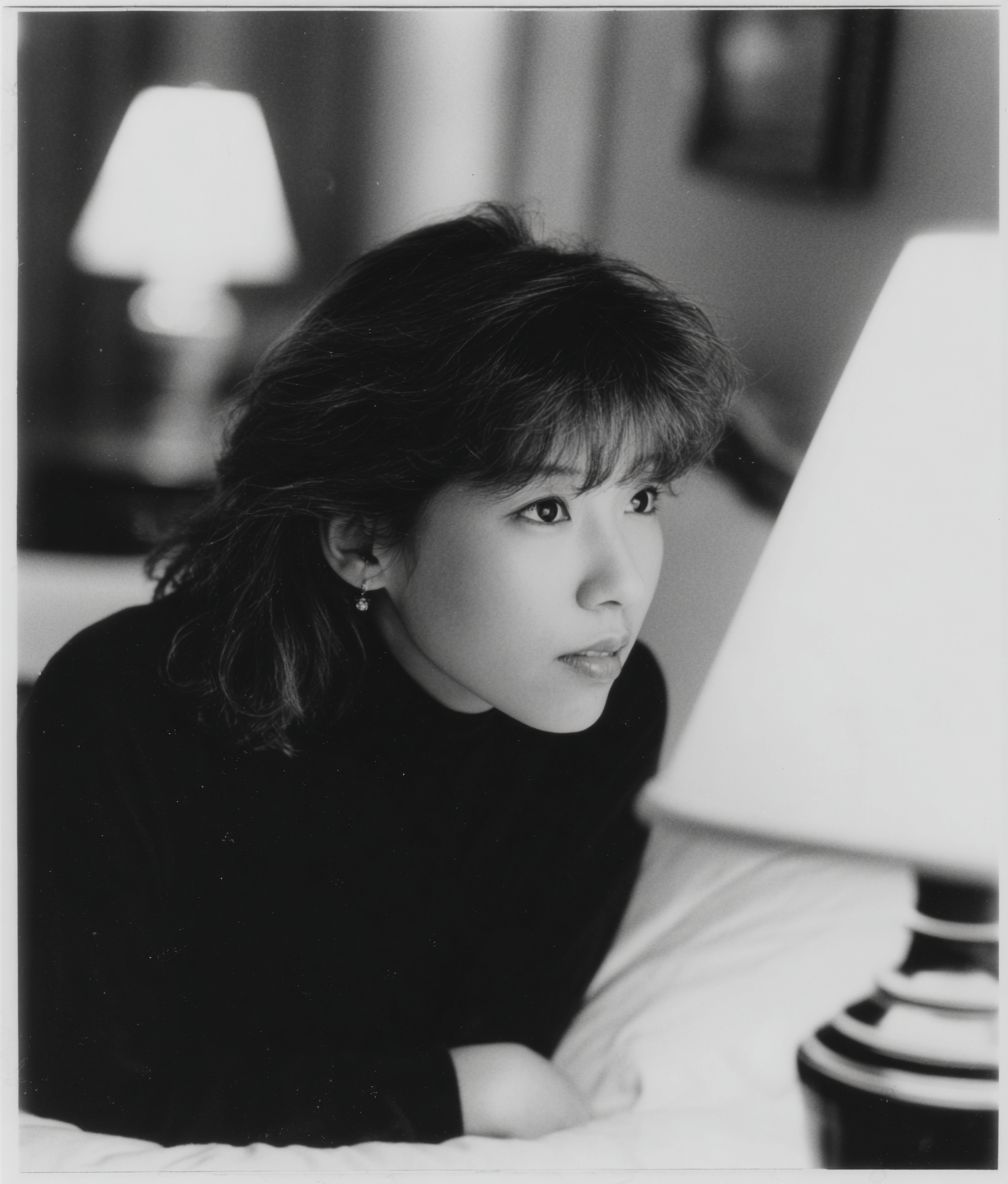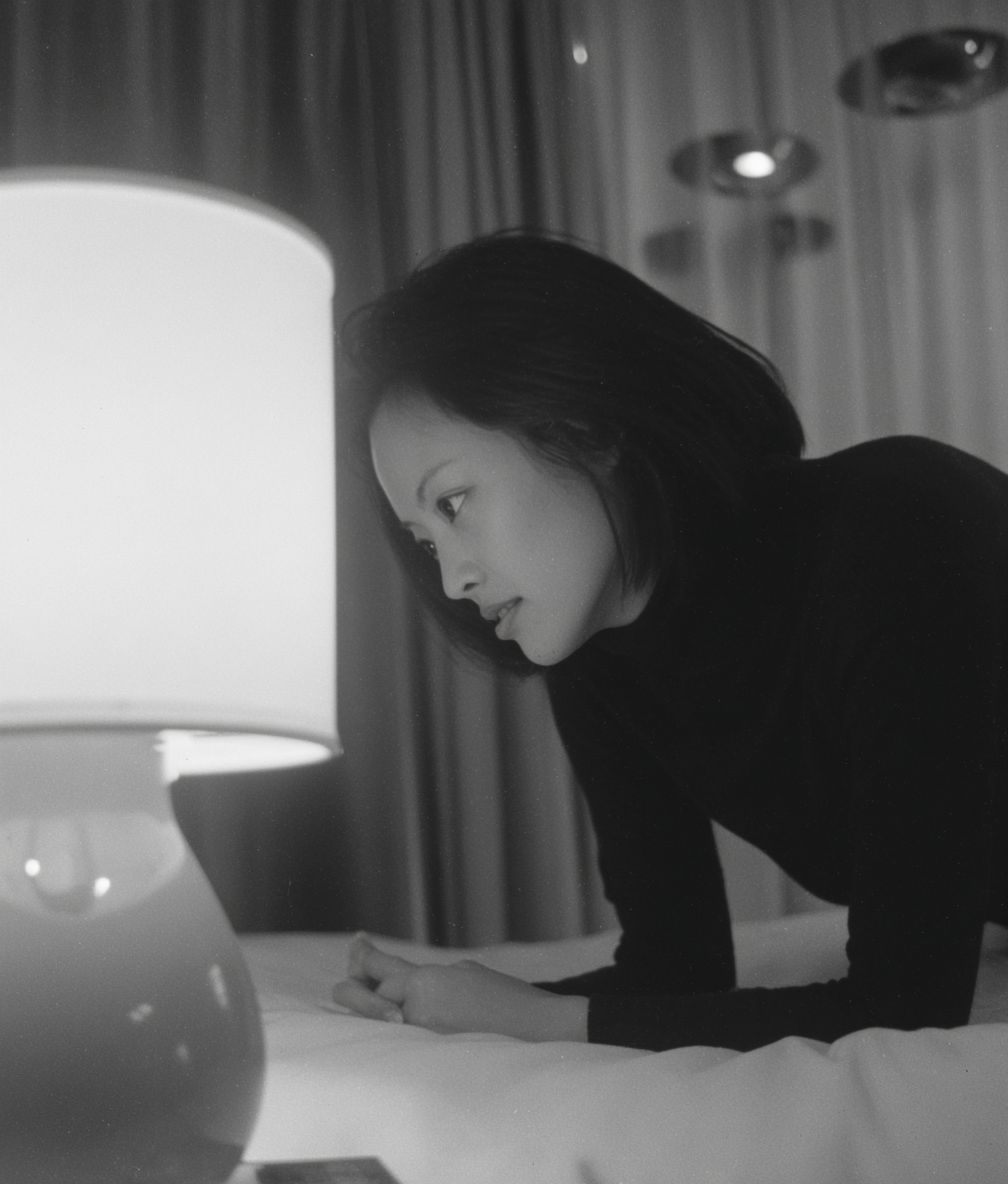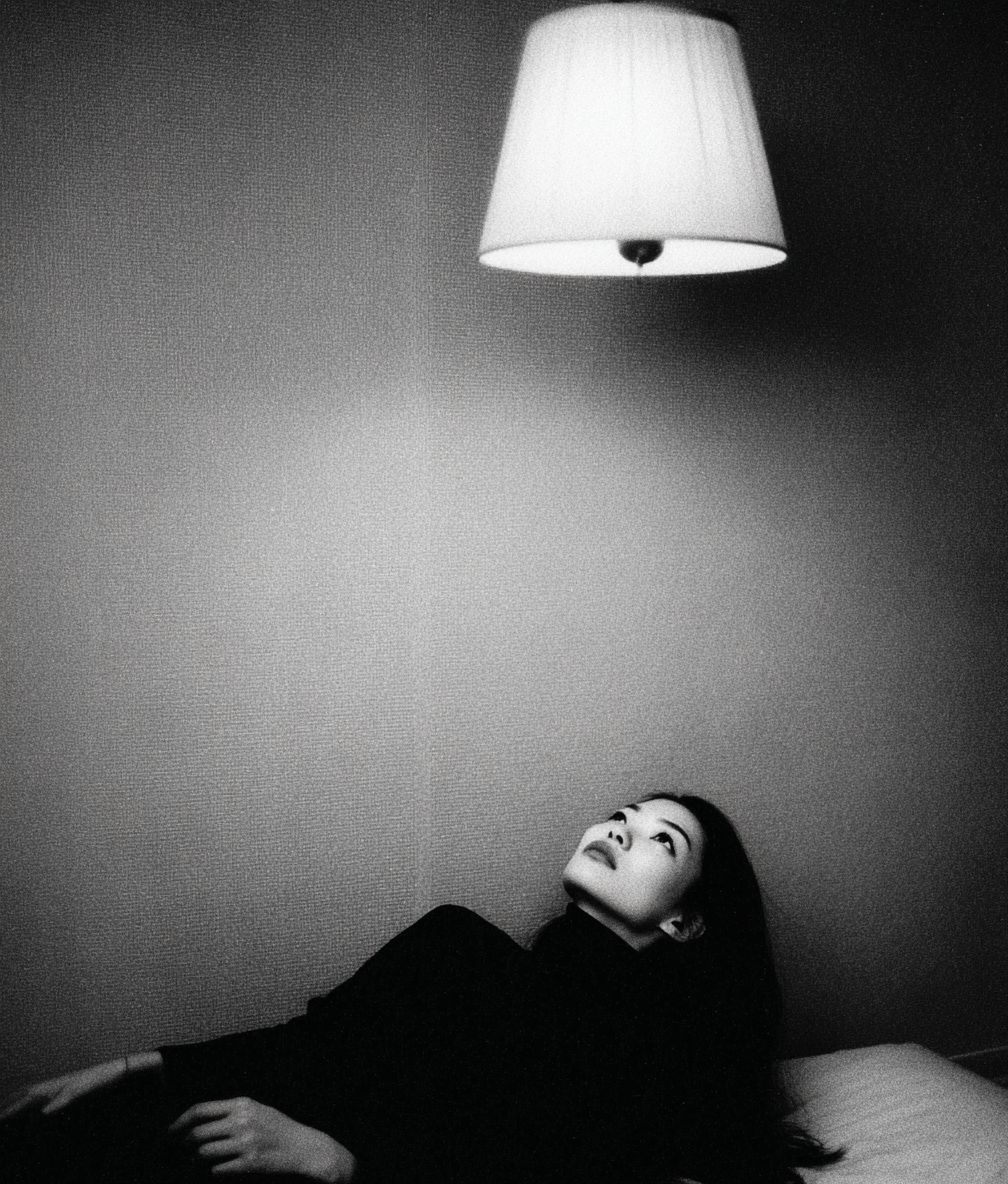 photography by Nobuyoshi Araki, A Japanese woman 27yo laying on bed in a classic modern hotel room, she is wearing a black turtle neck tops, Her gaze is focused on a lamp, an enraptured look, her side view, depth of field, dusty, film, grainy, pentax67, ilford, --chaos 30 --ar 6:7 --raw --stylize 50 --v 7.0