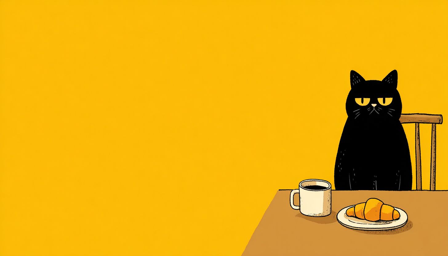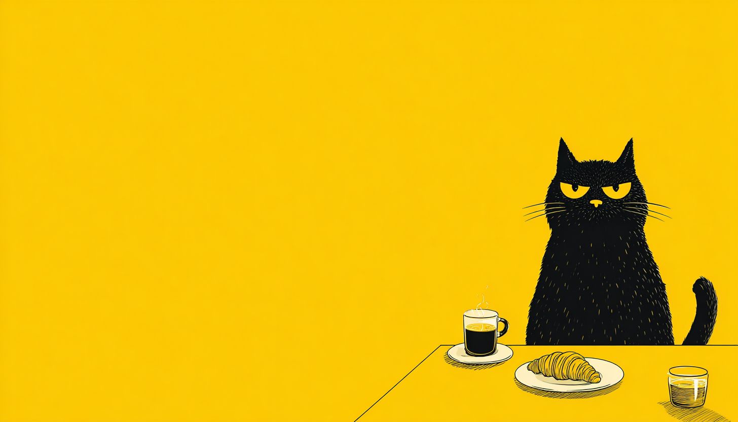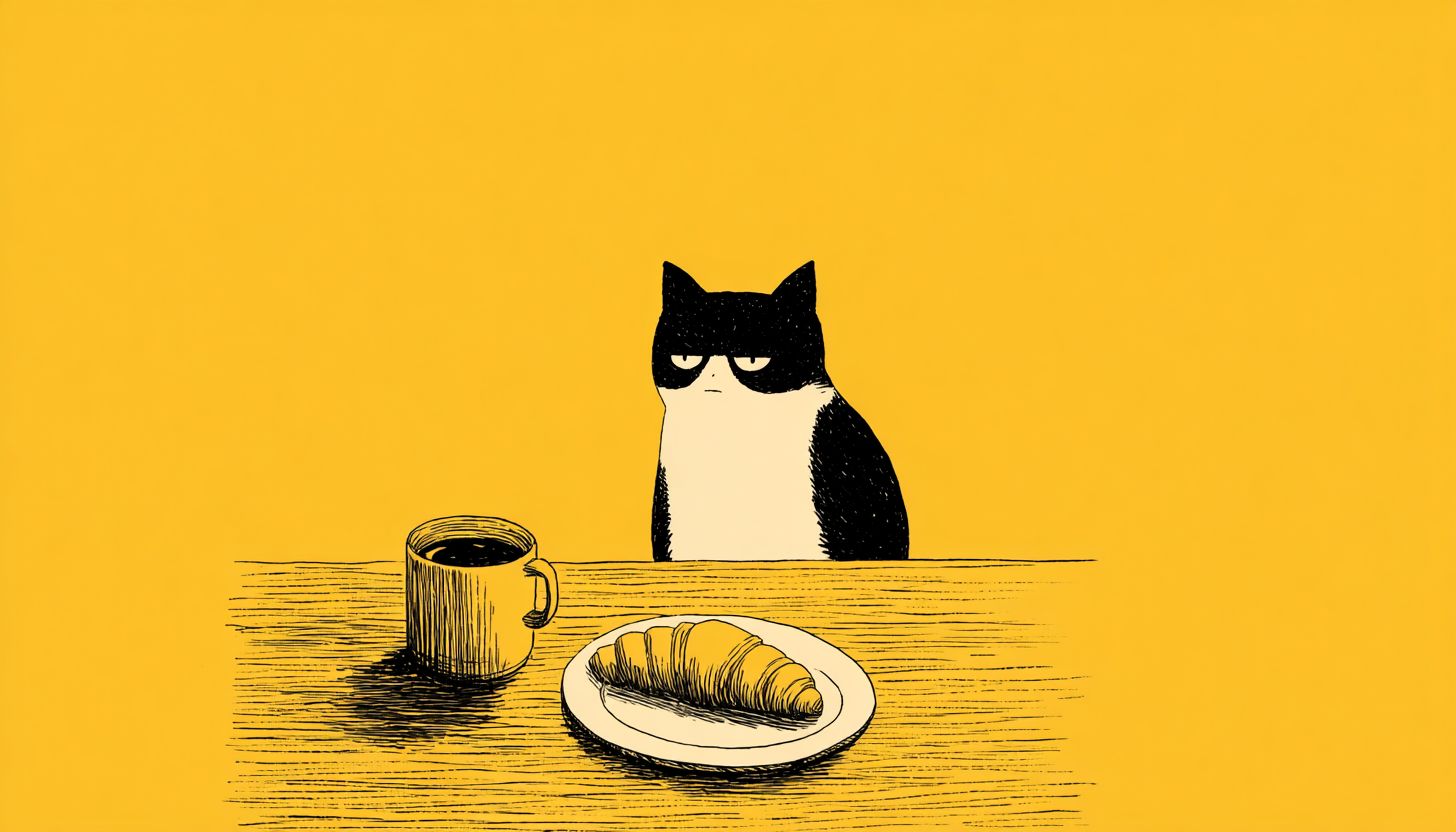 A minimalist image of a cat sitting at a table. The cat has a grumpy expression. On the table is a cup of coffee and a plate with a croissant. The colors are yellow and black.