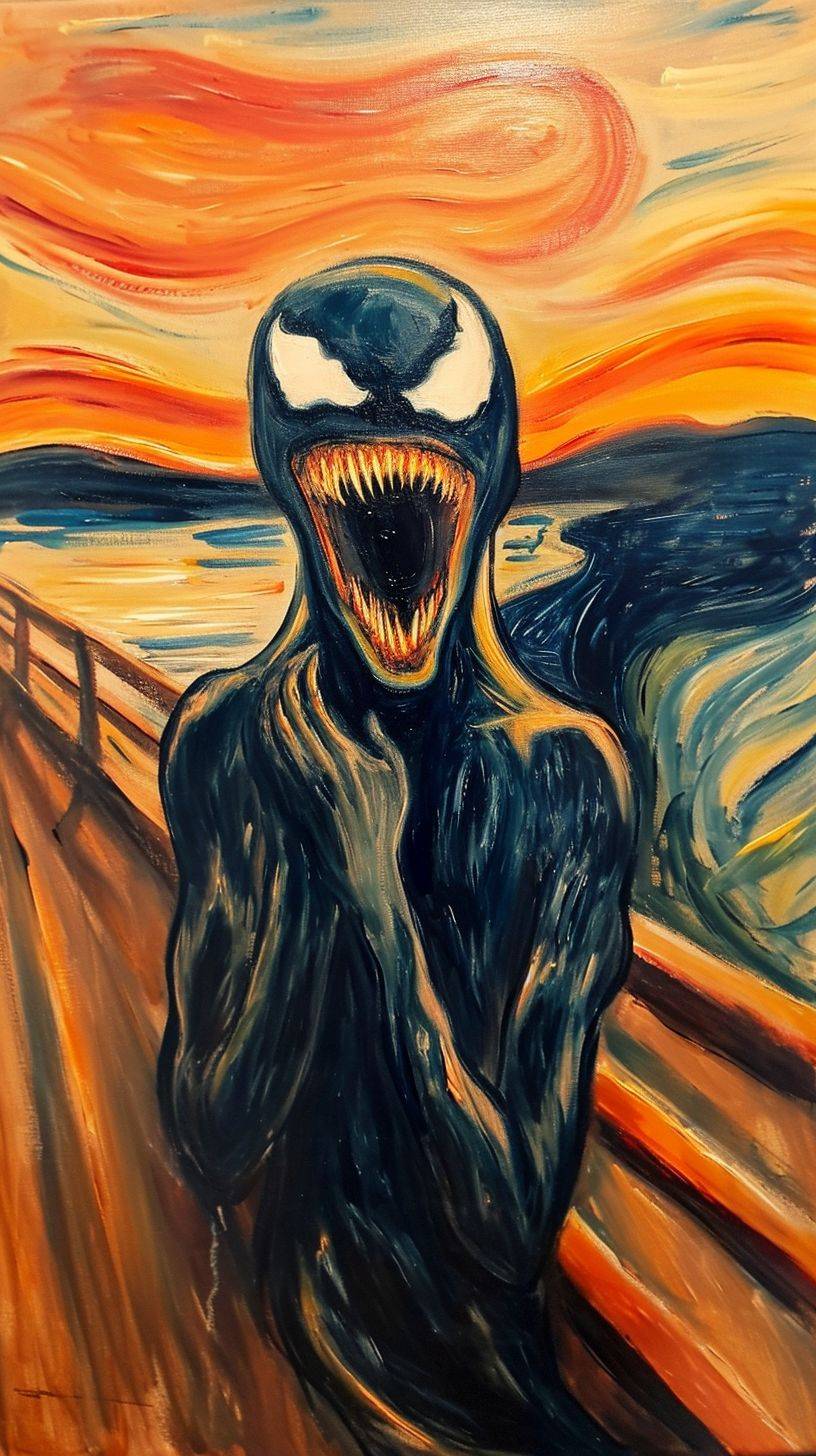 Venom screaming as in Edvard Munch's The Scream, in the style of meme art, light orange and light black, traditional oil paintings, dramatic scenes, emotional expressions, evocative figures, ominous landscapes, dry wit humor.