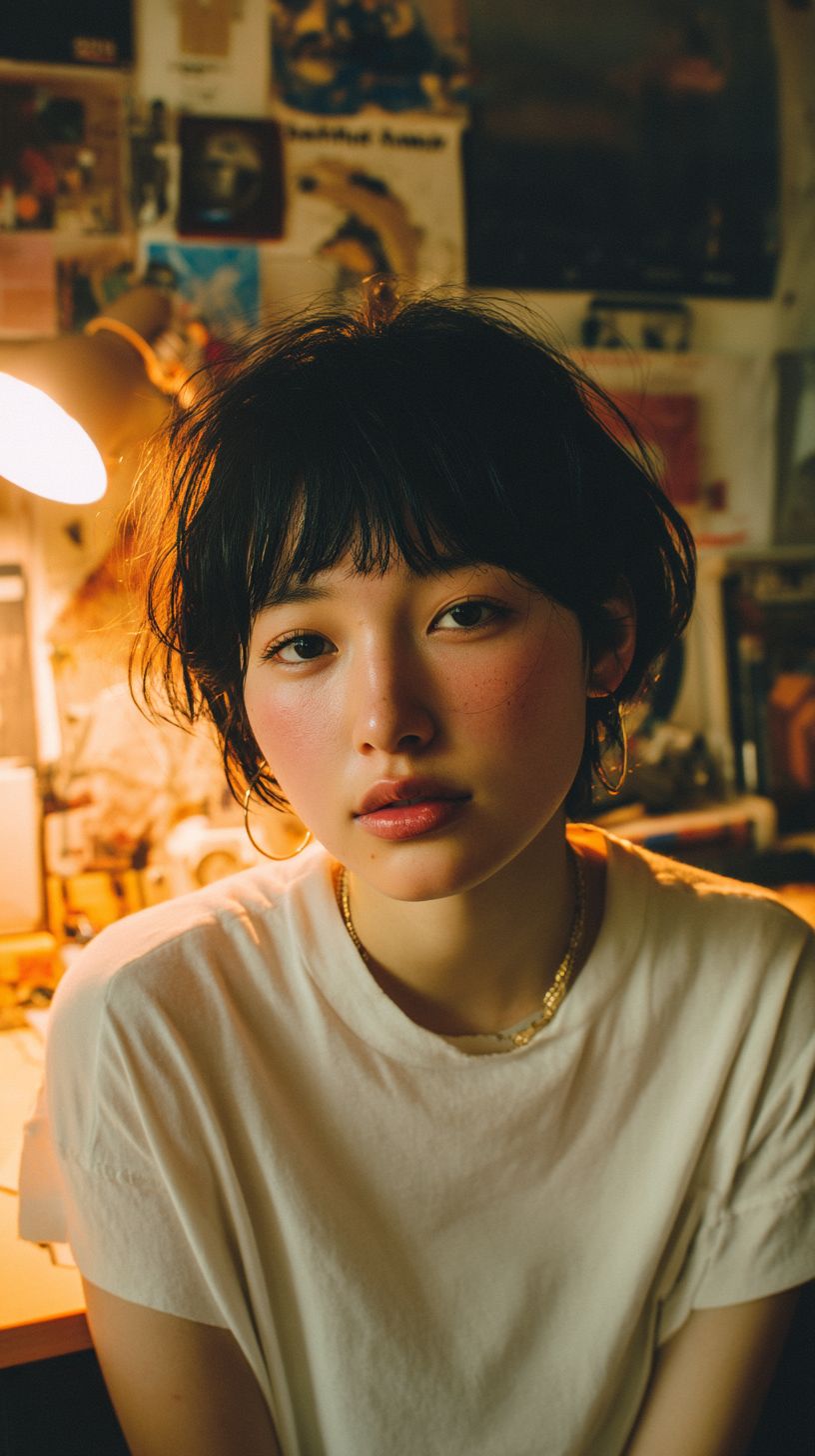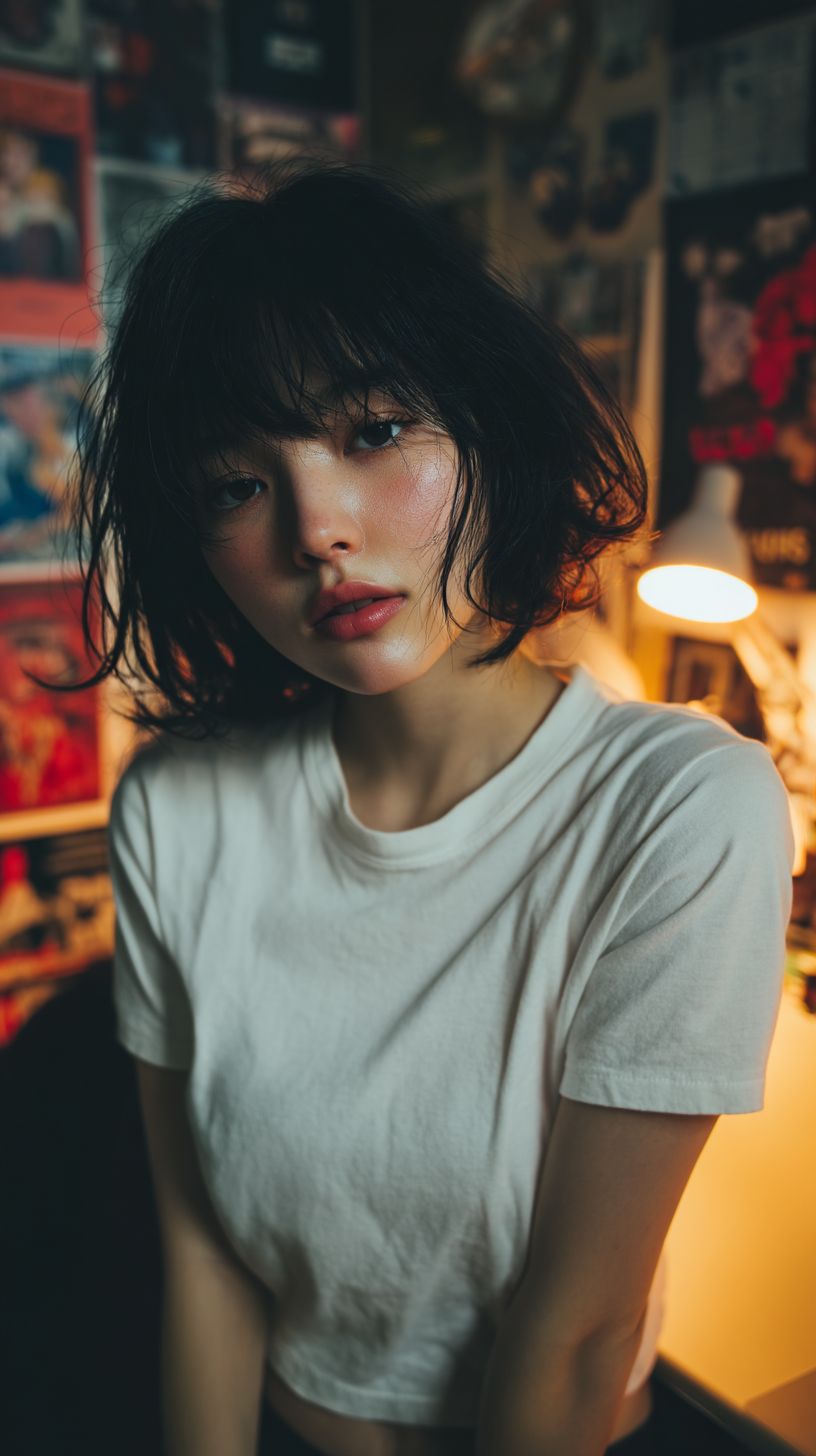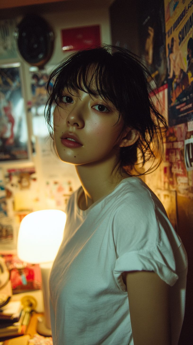 A photorealistic portrait of a young Japanese woman, early 20s, casual white T-shirt, natural makeup, messy short black hair with bangs, soft realistic skin texture with subtle pores, slight natural blush, cinematic low-light bedroom, warm desk lamp glowing in the background, wall covered with posters and objects, DSLR photo look, shot with a Canon EOS R5, 50mm lens, f/1.8 aperture, shallow depth of field, HDR, realistic cinematic lighting, immersive intimates perspective, ultra-detailed, film photography vibe --no cartoon, anime, illustration, 3d, cgi, painting, waxy skin, overly smooth, plastic look, distorted features, watermark, text --ar 9:16 --quality 2 --raw --v 7.0