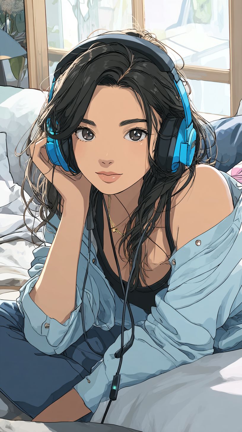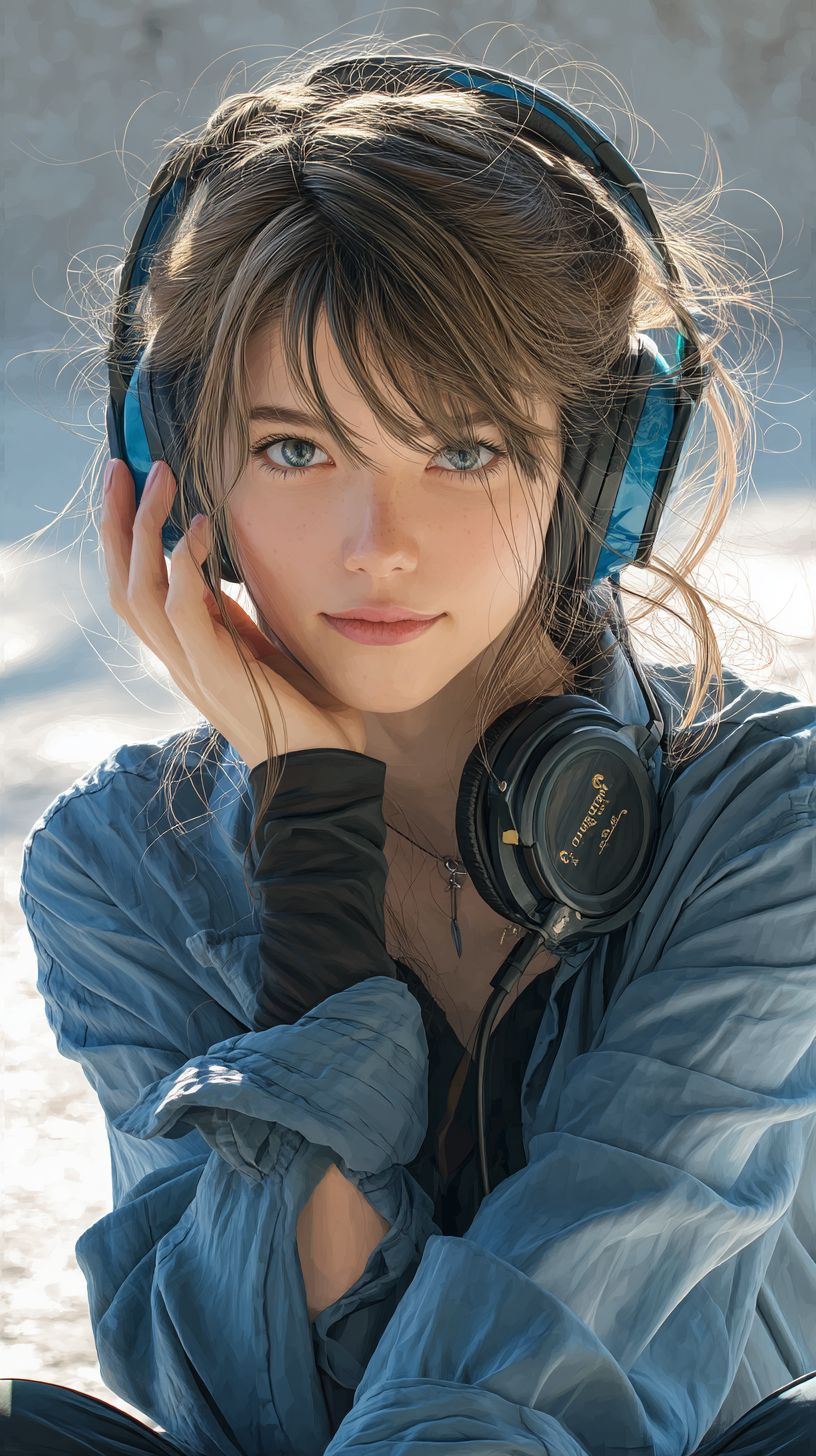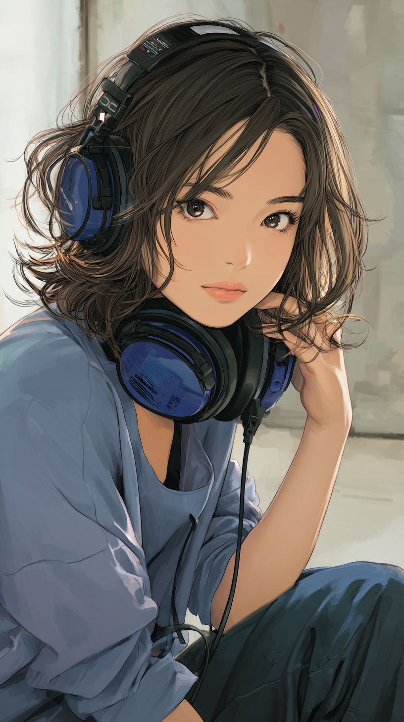 Cinematic realistic style illustration of a stylish woman in her 20s, her face resembles Nagi Inoue,, wearing blue and black headphones, sitting casually while facing the camera with direct eye contact. She looks relaxed and immersed in music, with a soft peaceful smile and dreamy expression as if enjoying her favorite song. Natural skin texture, expressive detailed eyes, ultra-detailed hair strands flowing slightly. Soft cinematic lighting with natural shadows, blurred minimal background. Relaxed and cozy atmosphere, realistic illustration, 8K ultra-detailed, no text --ar 9:16 --quality 2 --profile fv1tox4 --v 7.0