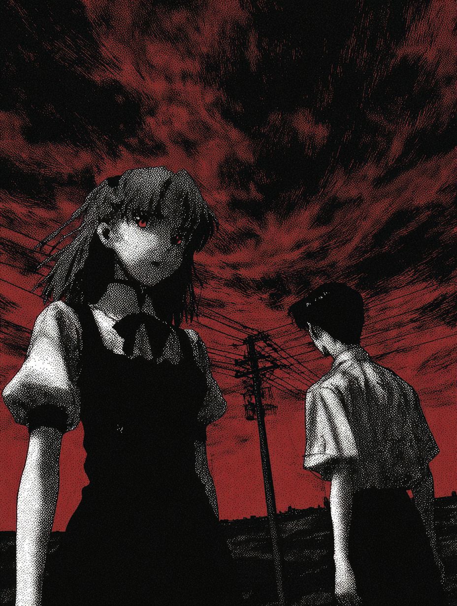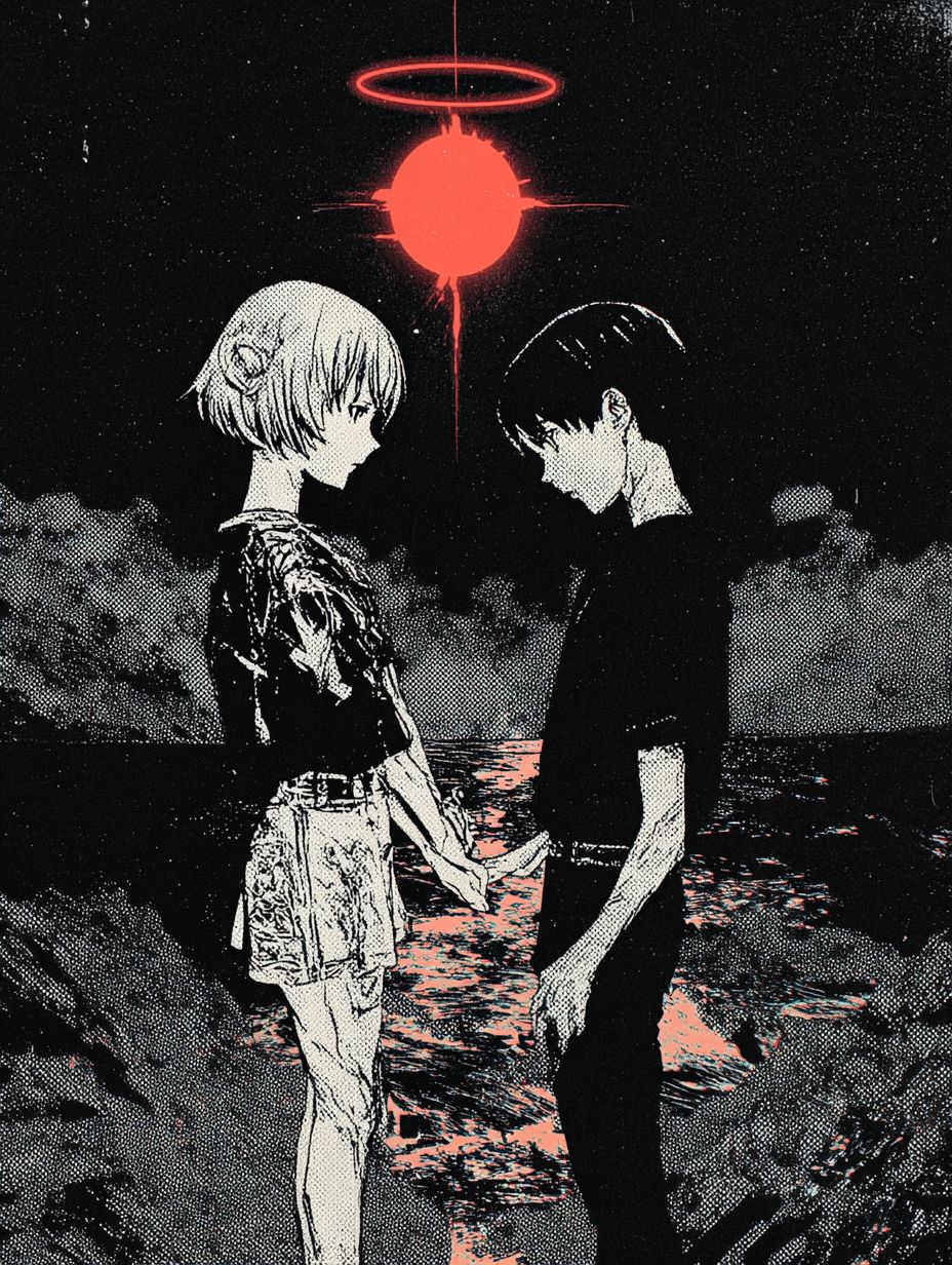 Surreal scene with Rei Ayanami and Shinji from 90s anime Neon Genesis Evangelion