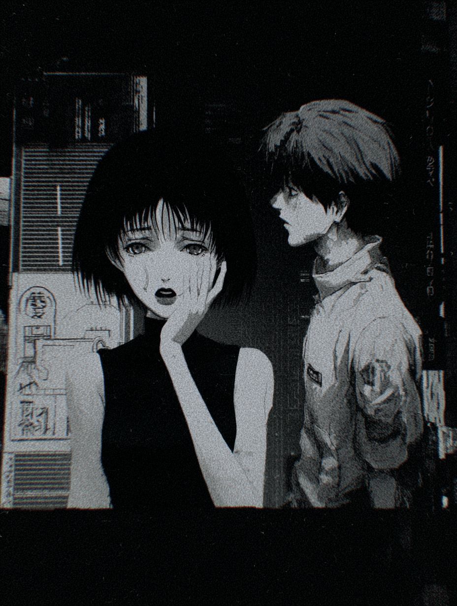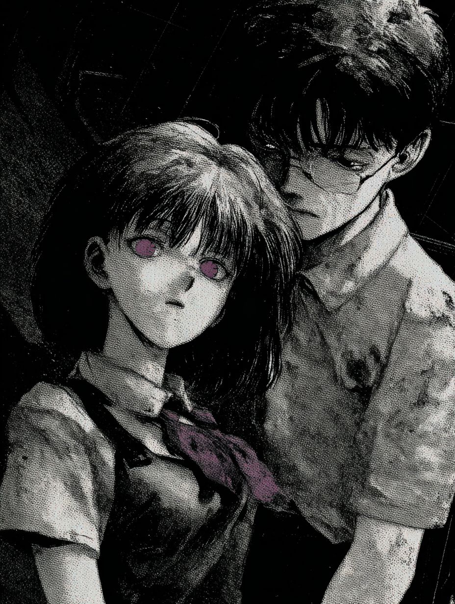 Screenshot from the 90s anime. Neon Genesis Evangelion, surreal scene with Rei Ajanami and Shinji. Lo-fi aesthetic, dark colors, dark atmosphere. --ar 3:4 --profile a6uwc95 --stylize 50 --v 7.0