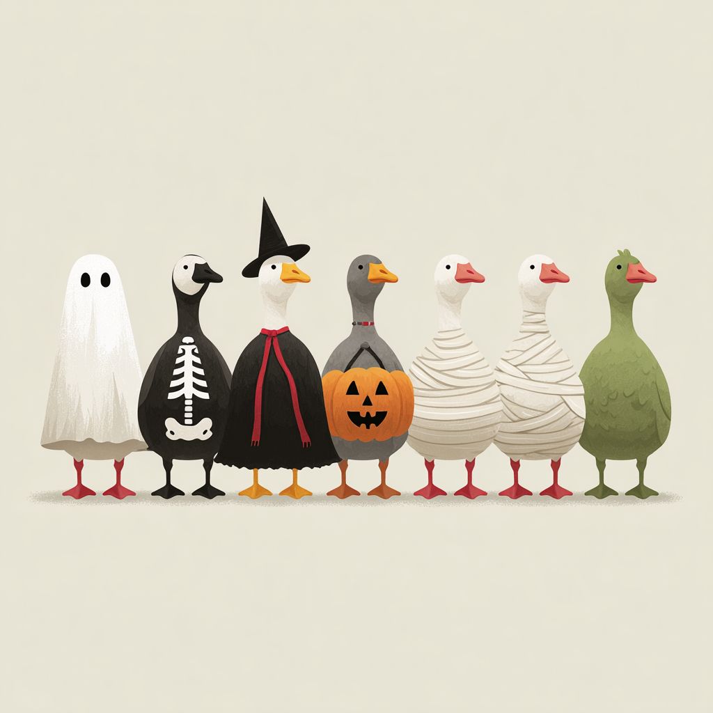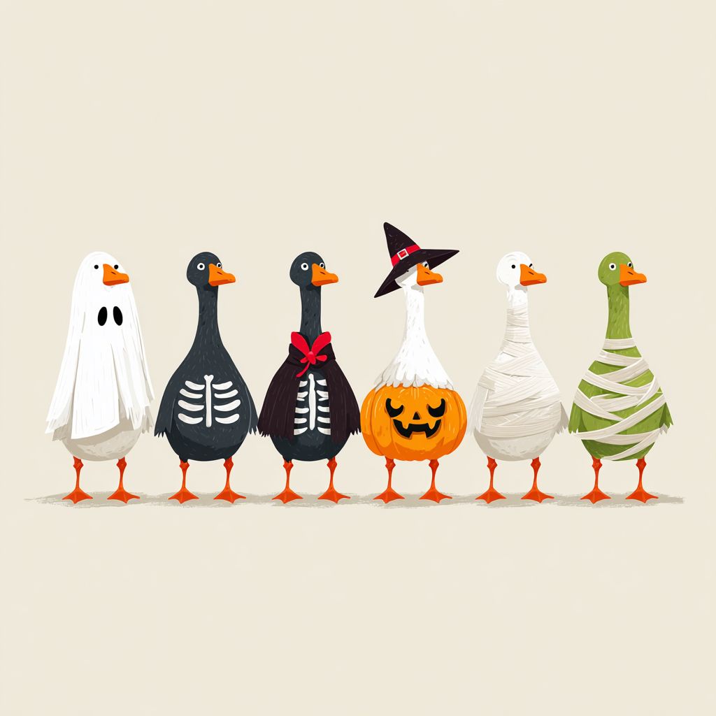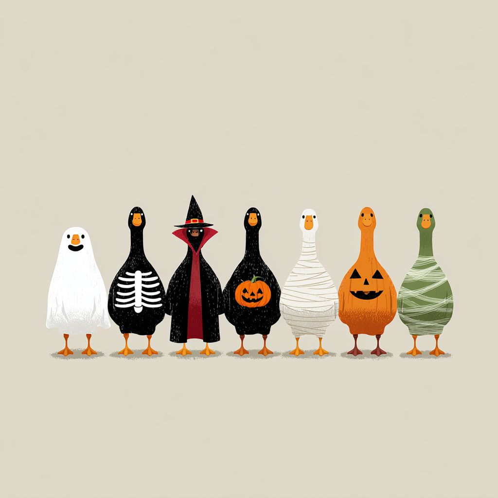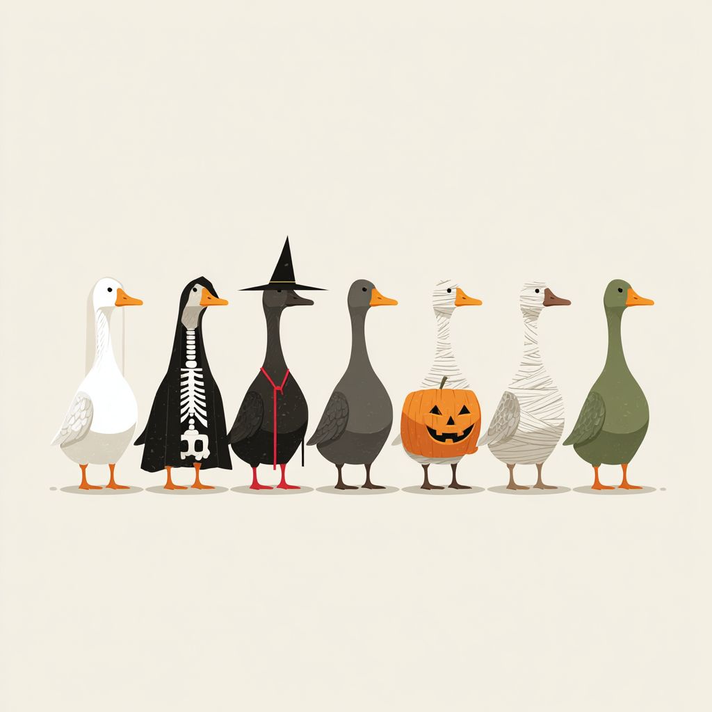 Minimalist cartoon illustration of seven geese standing in a row, each wearing a different Halloween costume. Goose 1: ghost covered with white sheet. Goose 2: skeleton pattern on the body. Goose 3: black cloak with red vampire collar. Goose 4: witch hat and broom. Goose 5: pumpkin belly. Goose 6: wrapped completely in mummy bandages. Goose 7: green goose with a carved jack-o’-lantern pumpkin head. Flat vector style, simple clean outlines, solid colors, no shading, off-white background. high resolution
