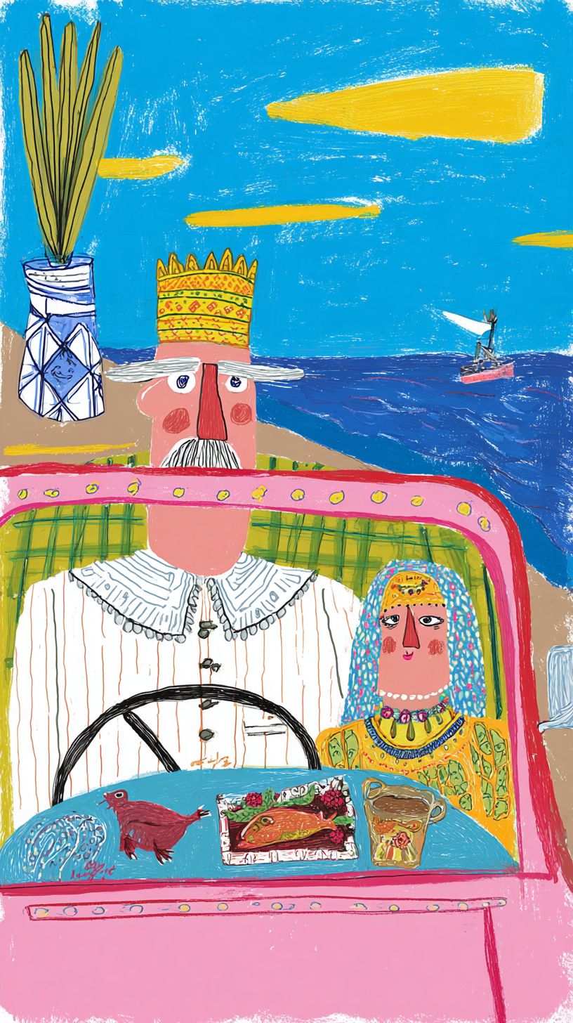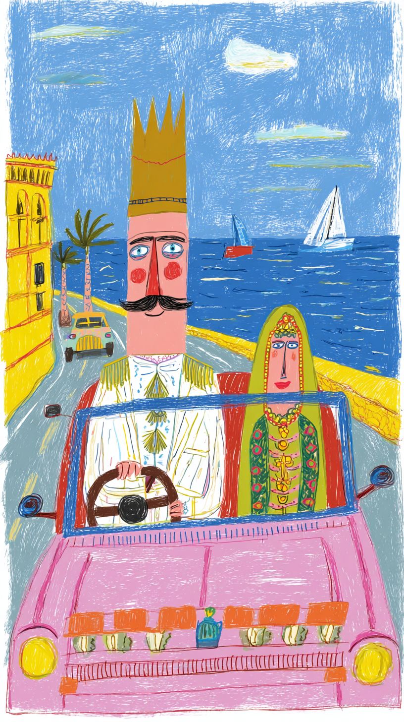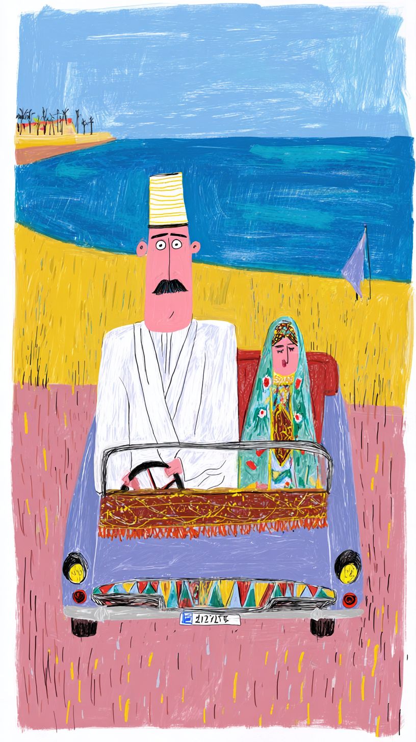 A richly detailed close-up illustration in naive hand-painted style, baroque and humorous atmosphere. A clearly masculine elderly Maghrebi man, the Hajj, with a mustache and dignified face, drives a luxurious convertible car by the seaside at sunset. He wears a traditional white outfit with a fez. Beside him, a clearly feminine elderly Maghrebi woman, the Hajja, sits proudly, wearing a colorful veil and traditional dress with ornaments, her expression playful and joyful. The scene is funny and iconic, with saturated colors, naive texture, whimsical details, ocean and golden sunset in the background, --ar 9:16 --sref 8143