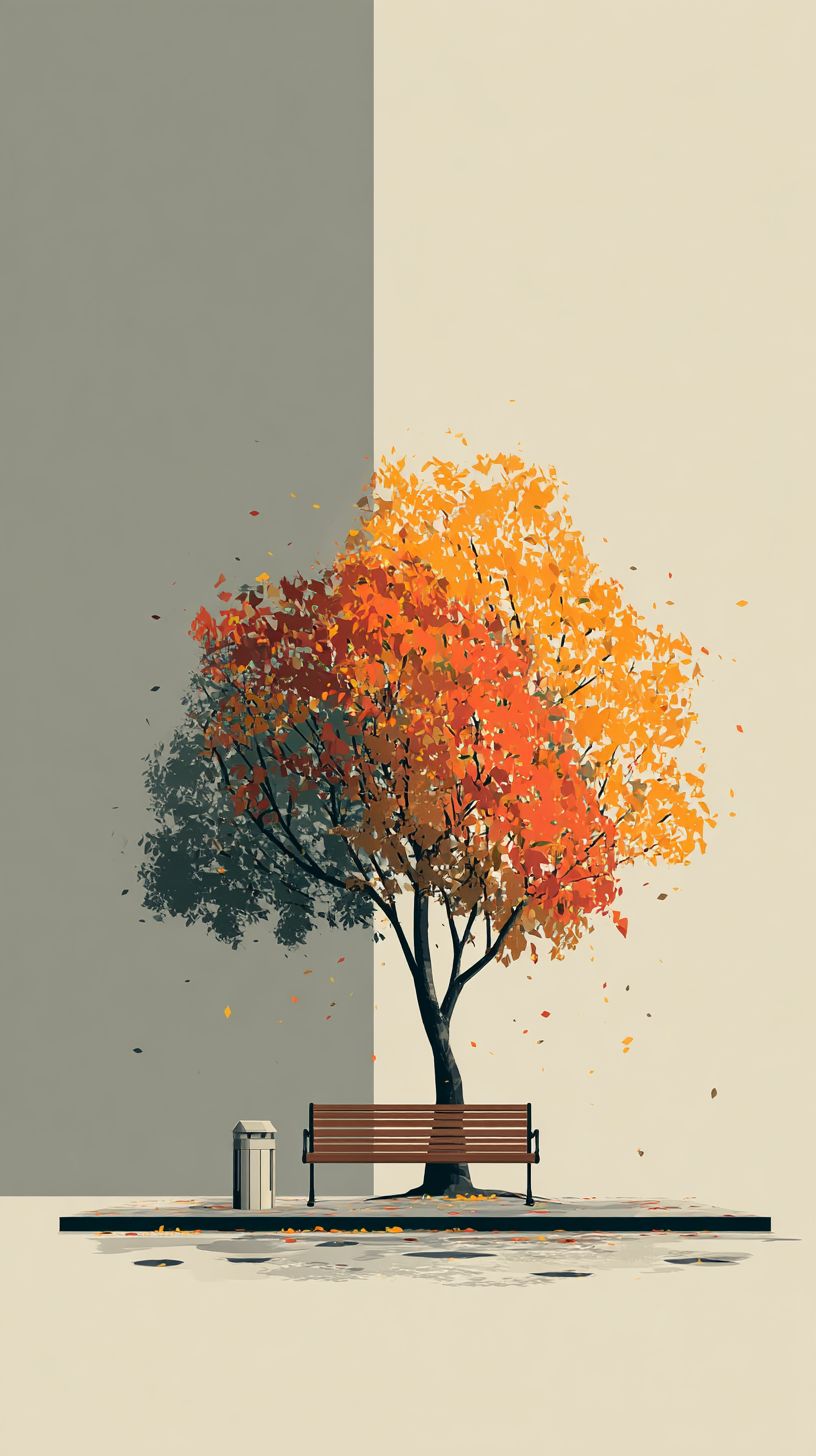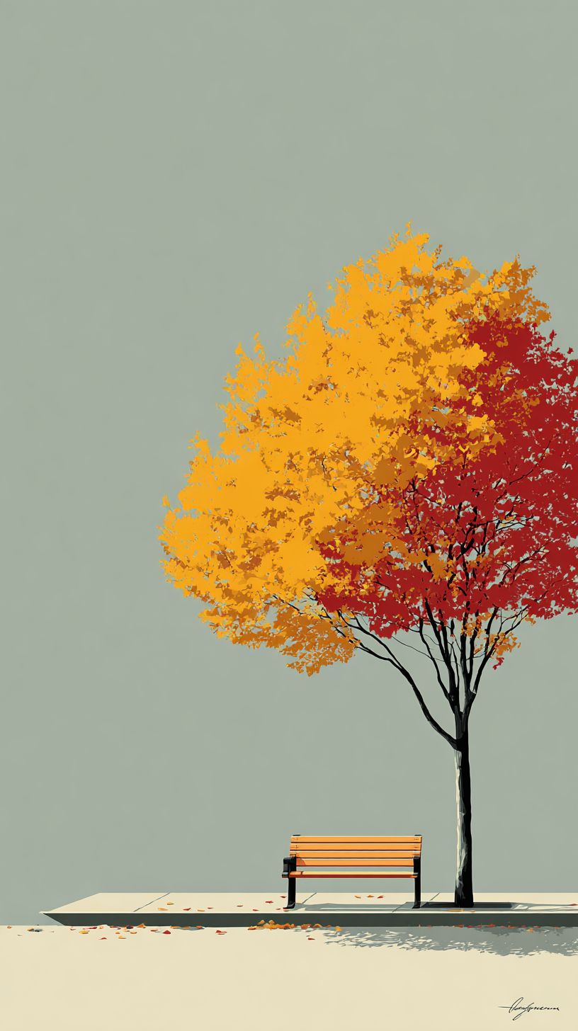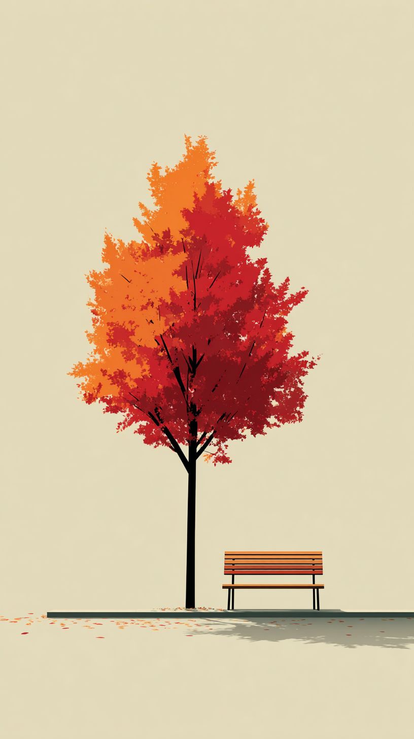 An autumn tree with colorful leaves and a bench underneath