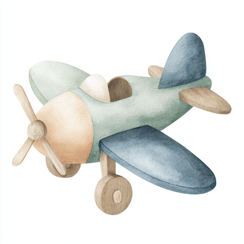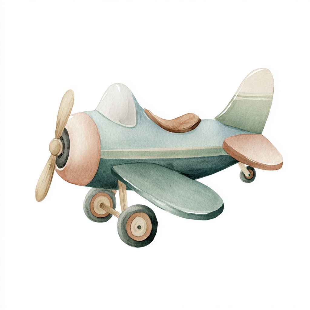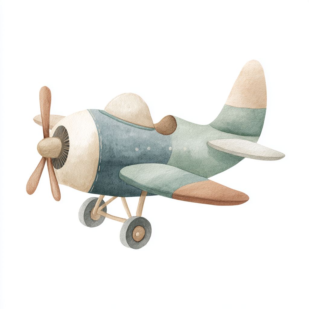 cute watercolor illustration of a toy airplane, Scandinavian nursery style, soft muted colors, dusty blue, sage green, beige, minimal and modern, soft pastels, white background