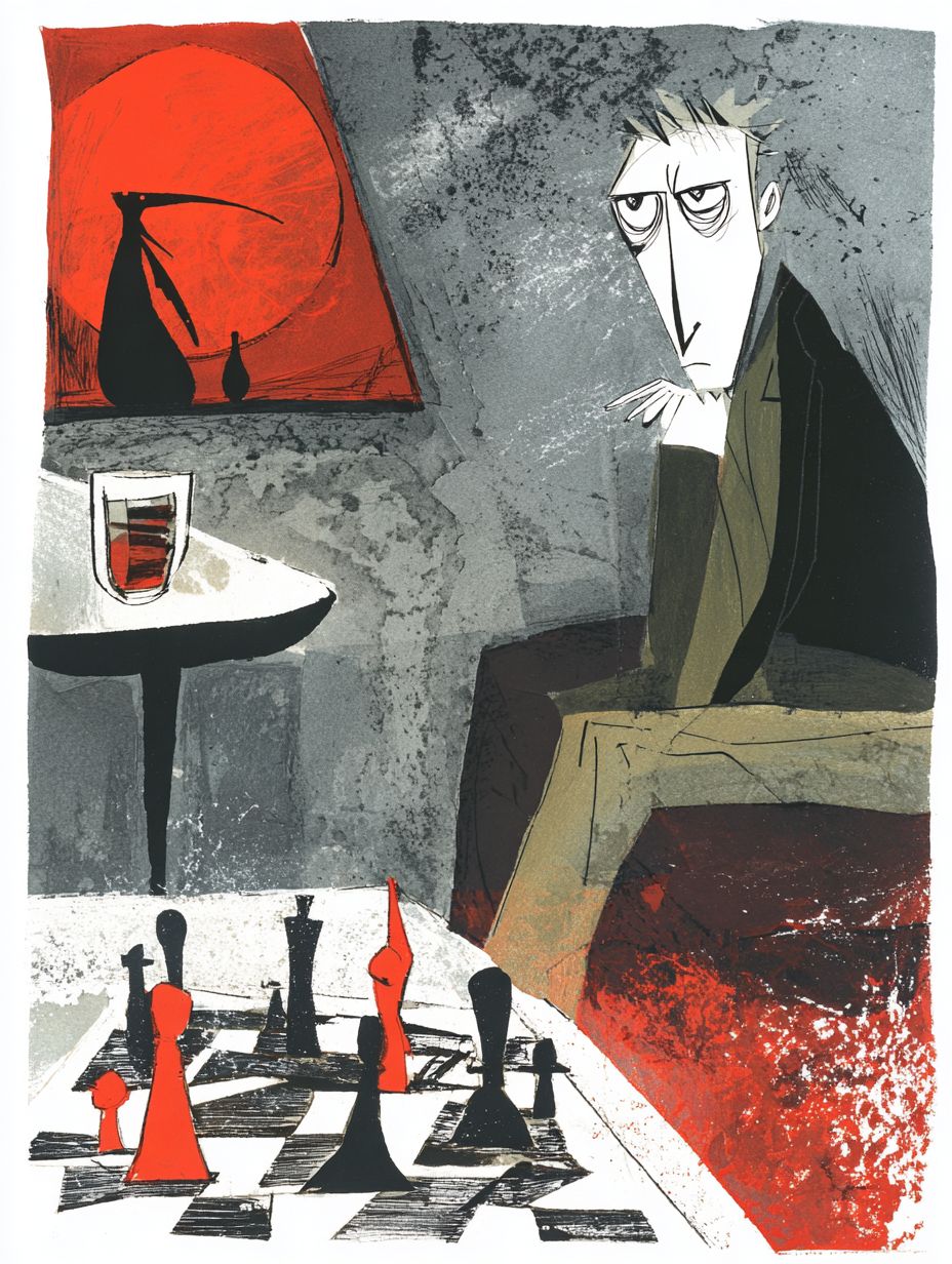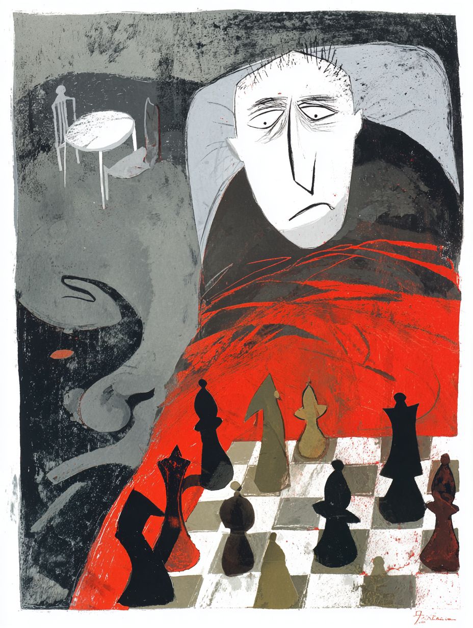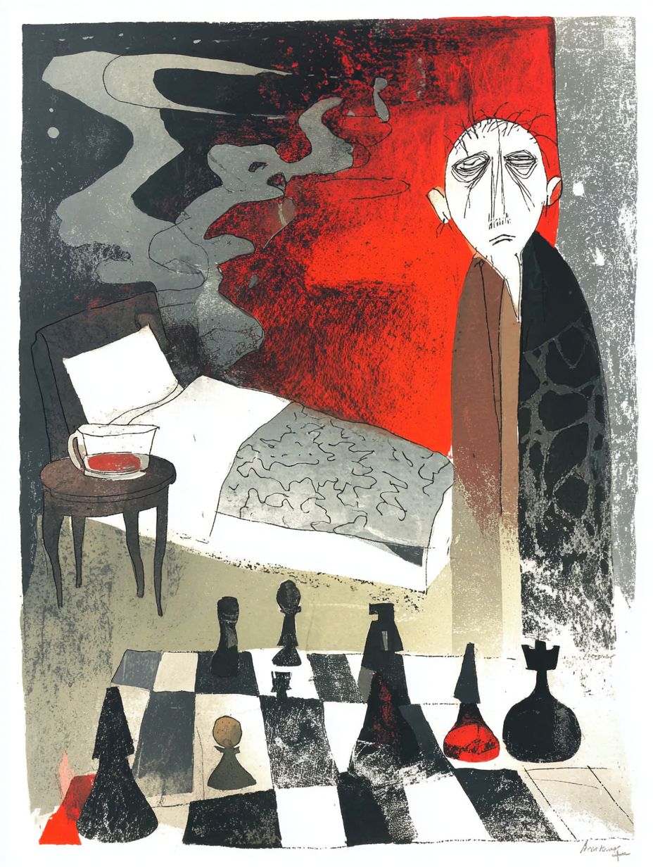 A gray room contains a table and a simple bed with a tense gray man staring at a chess board on the floor
