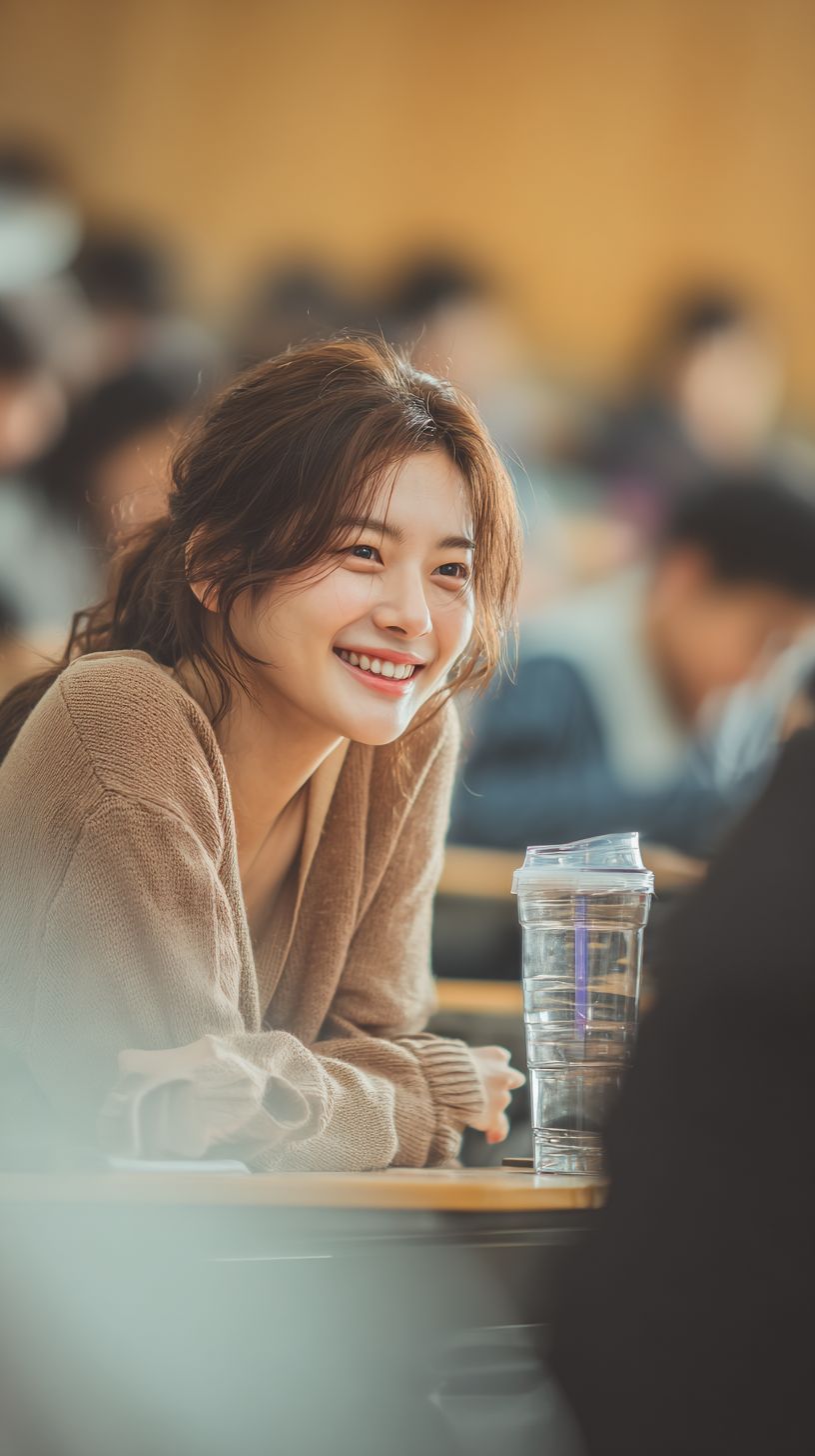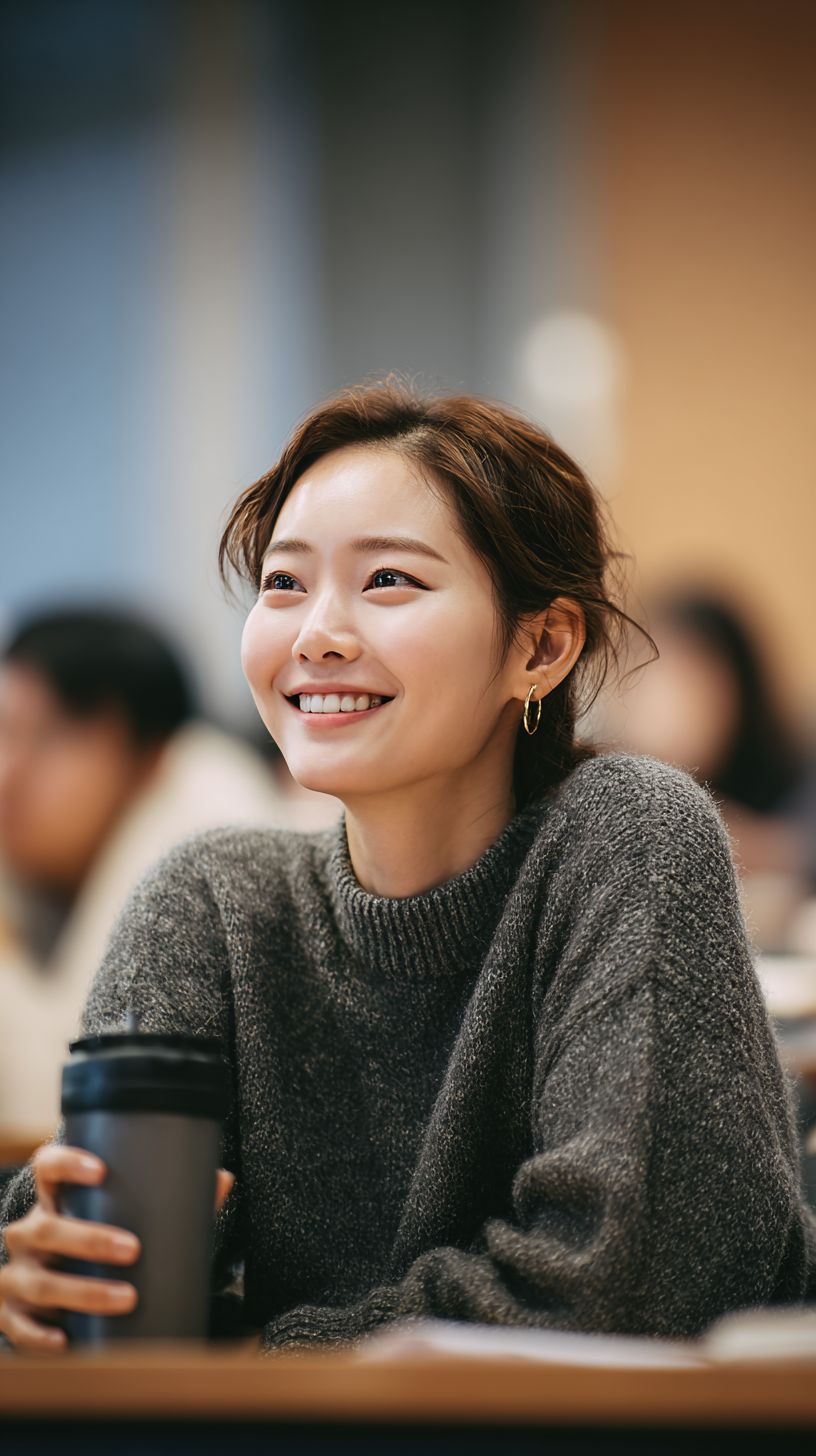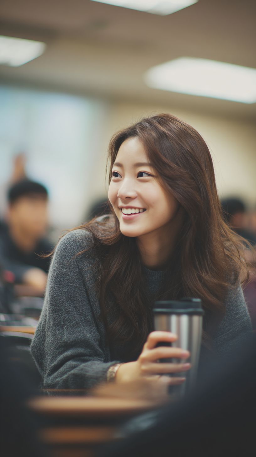 A beautiful Korean woman in her 20s sitting at a university classroom desk, holding a tumbler while chatting with the person beside her, blurred classroom background, warm and friendly mood, soft indoor daylight, shallow depth of field, casual campus look --ar 9:16 --raw