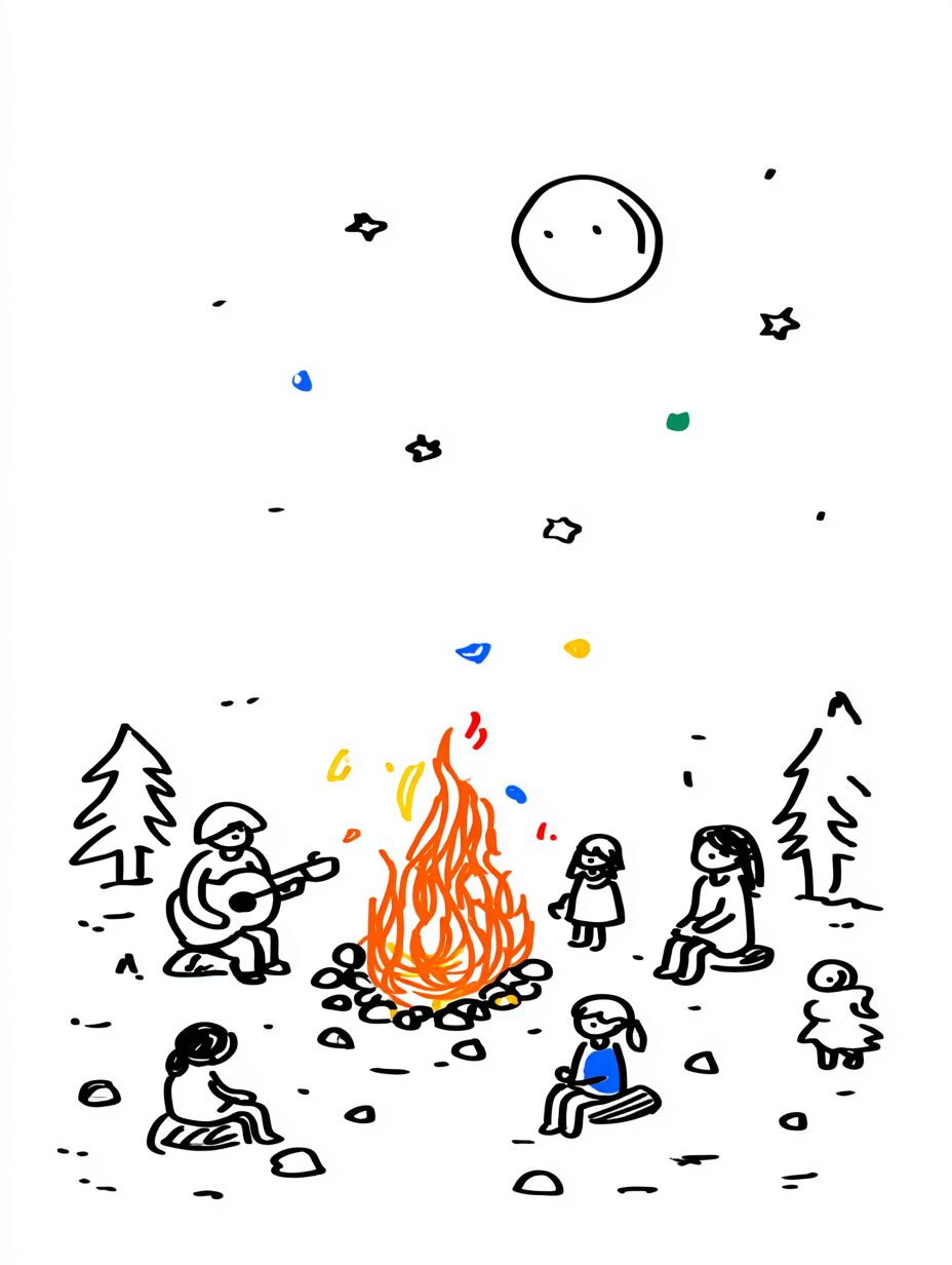 a guy guitar player sitting around a large colored fire 5 kids and parents around , large moon in the sky with no stars, vector, white background --ar 3:4 --sref 551132300