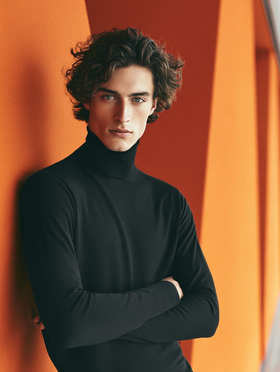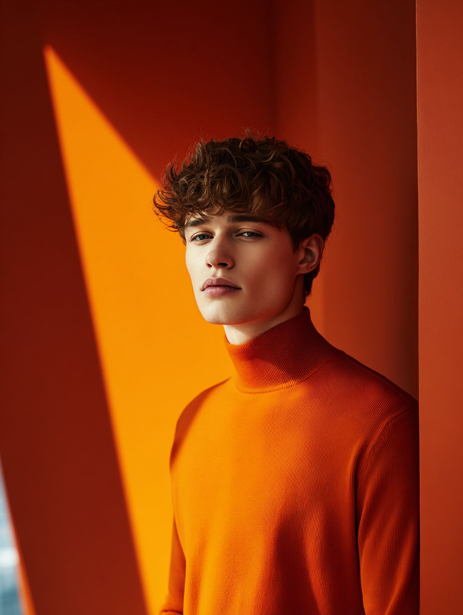 a young male model with refined and delicate facial features, wearing seamless round-neck thermal wear made of polyester fiber, clean body-hugging fit, smooth elastic knit texture, showcasing refined tailoring lines and subtle fabric tension, no turtleneck, no logos, standing inside a modern orange-red geometric architectural space, with soft cinematic lighting and warm shadows creating spatial depth, premium fashion campaign, minimalist luxury advertisement style, Uniqlo and Loro Piana aesthetic --ar 3:4