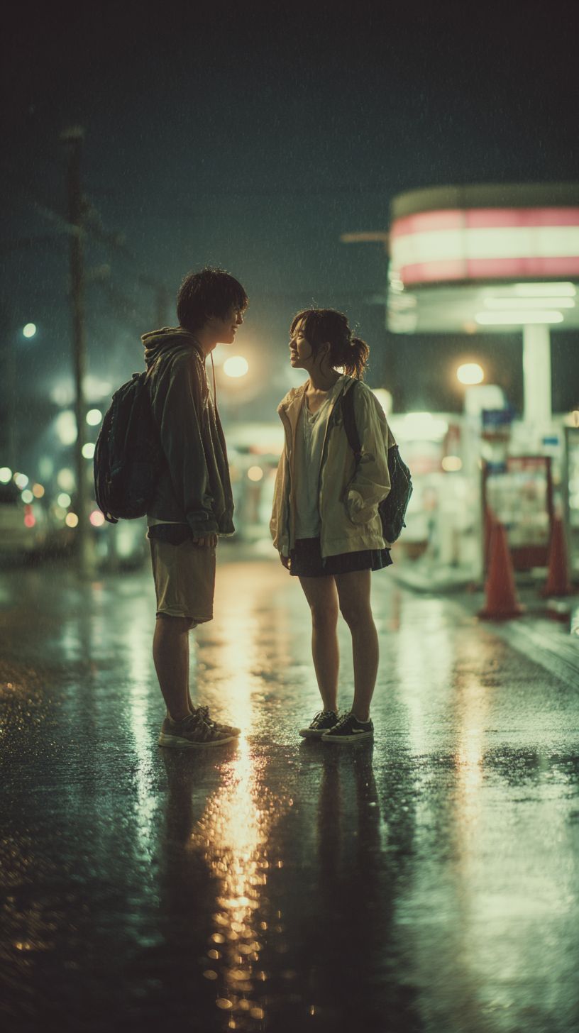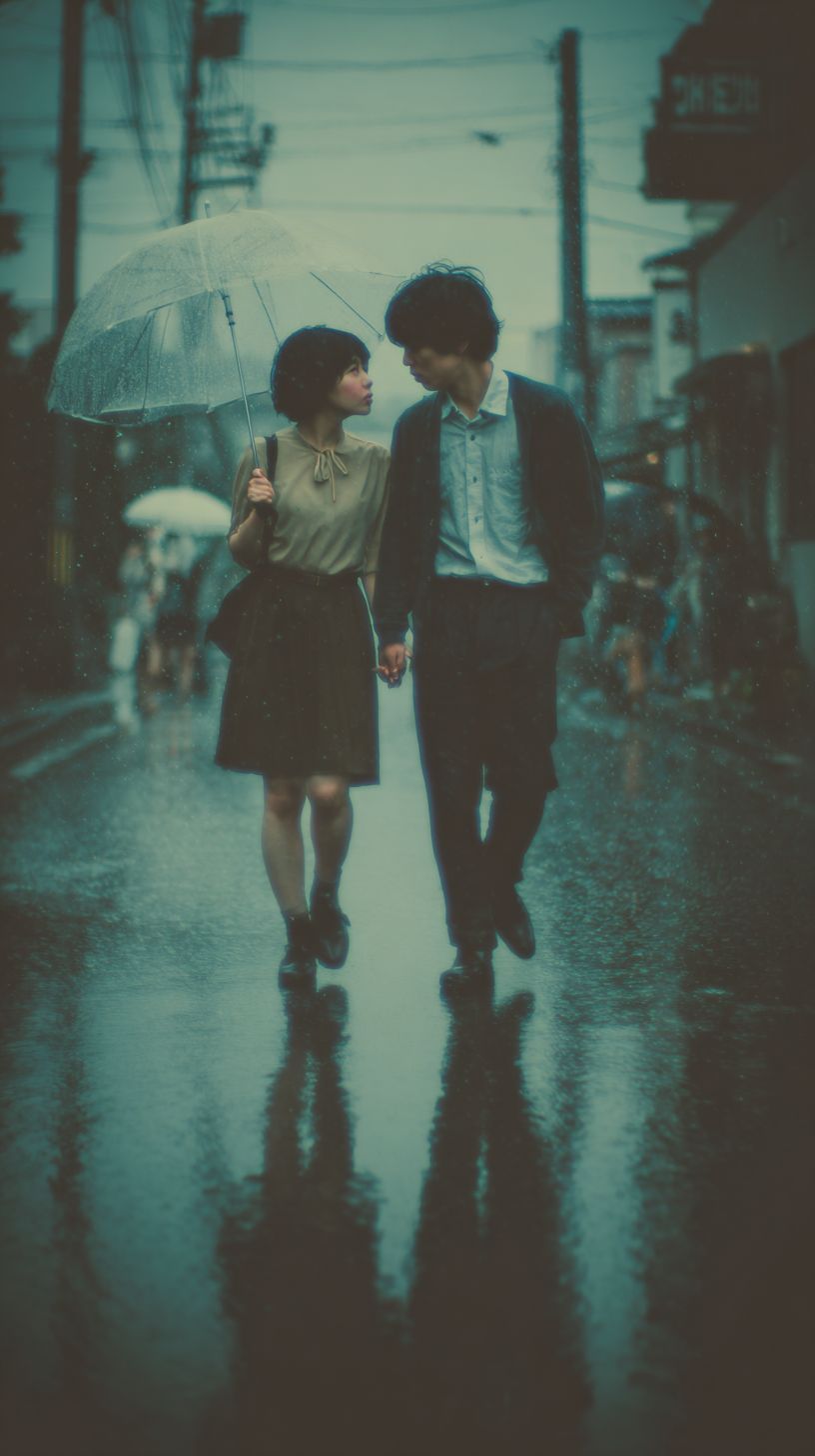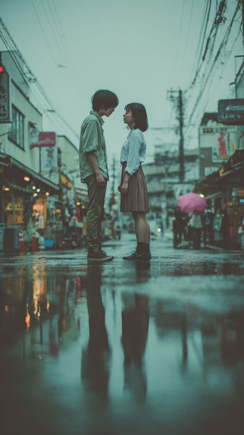 a young Japanese couple in their 20s, running in the rain without umbrellas, stopping and staring into each other's eyes, reflections on wet asphalt, cinematic Japanese indie film style, glossy wet surface, soft pastel tones, melancholic yet romantic, handheld low angle shot --raw --ar 9:16