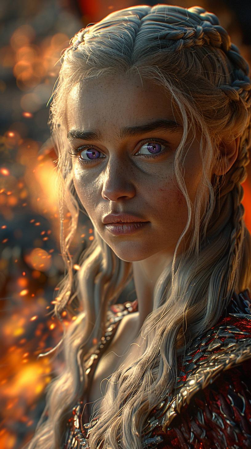 Daenerys Targaryen from Game of Thrones with purple eyes, surrounded by flames, riding a dragon.