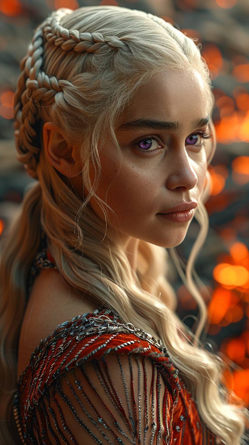Daenerys Targaryen from game of thrones with purple eyes, surrounded by blazing orange riding on a dragon. hyper-realistic, 8k, --ar 9:16 --stylize 750 --v 6.0