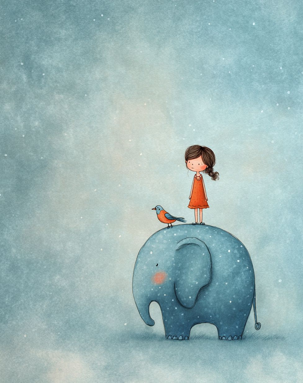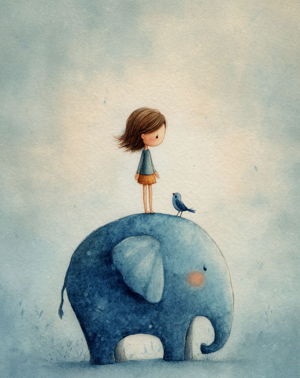 A little girl with rosy cheeks standing on top of a gentle blue elephant, a small bird perched beside her, dreamy watercolor illustration on textured paper, soft pastel tones, poetic children’s book style --ar 11:14 --raw