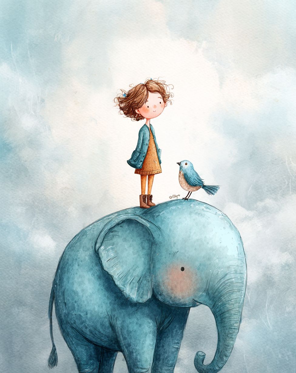 A little girl with rosy cheeks standing on top of a gentle blue elephant, a small bird perched beside her, dreamy watercolor illustration on textured paper, soft pastel tones, poetic children’s book style