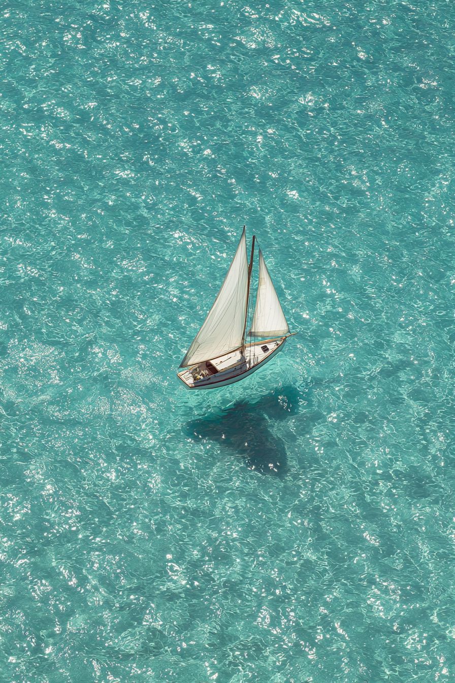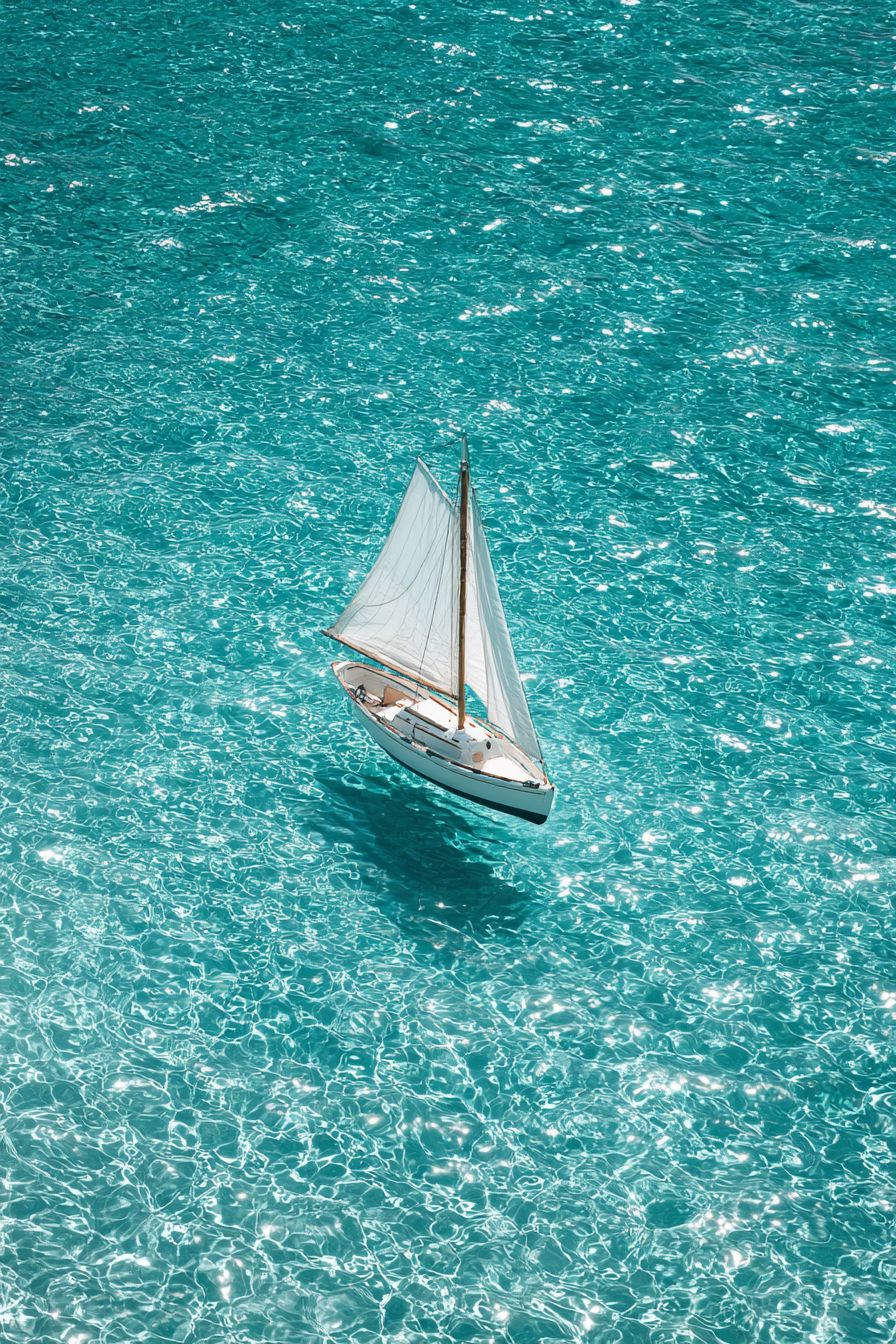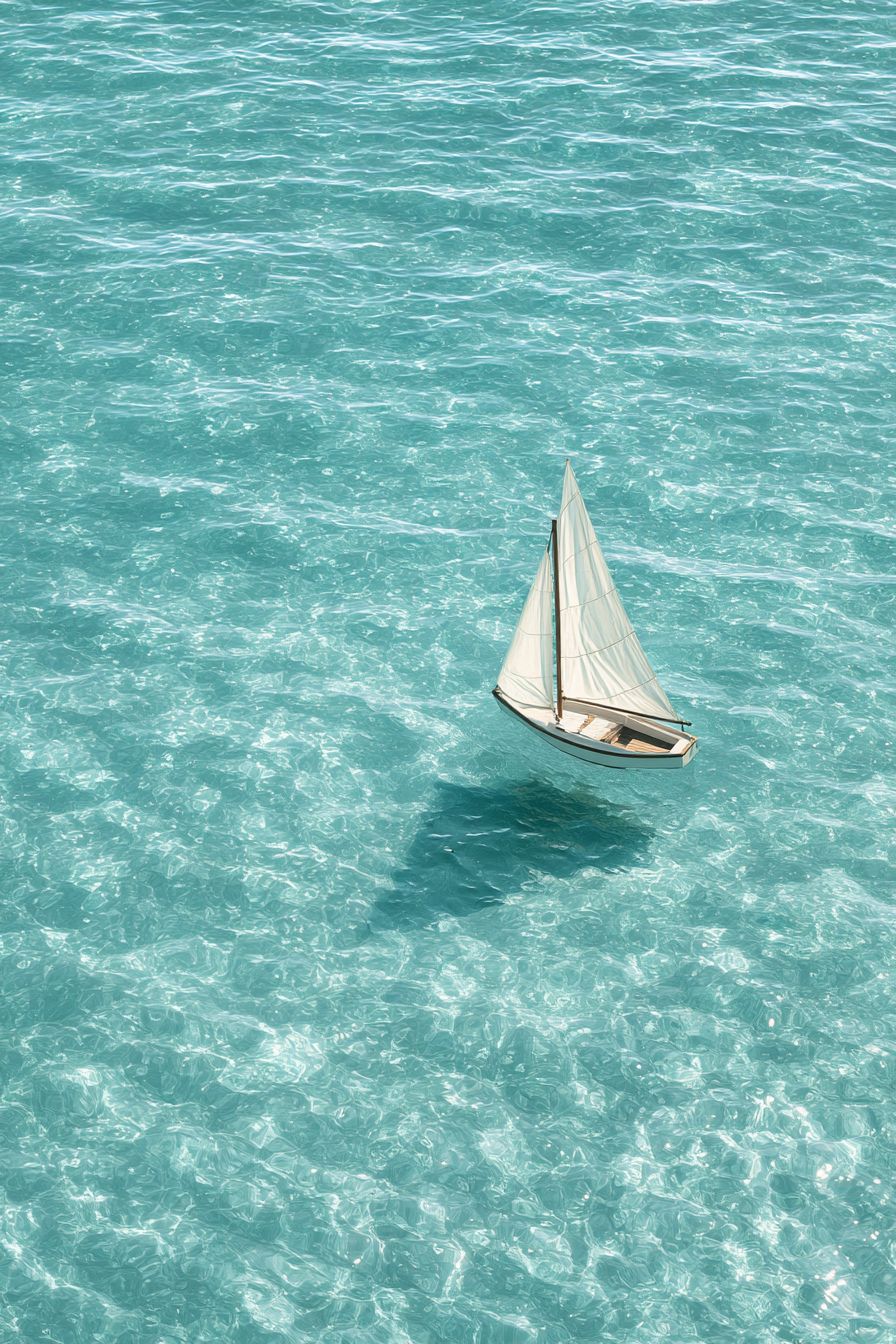 side view of a small white sailboat with two sails clearly visible, floating in the middle of crystal-clear pool-like turquoise water, bright aqua tones, transparent and luminous surface, sunlit ripples sparkling, minimalistic serene composition, no people, no background distractions, minimalist wall art style --ar 2:3