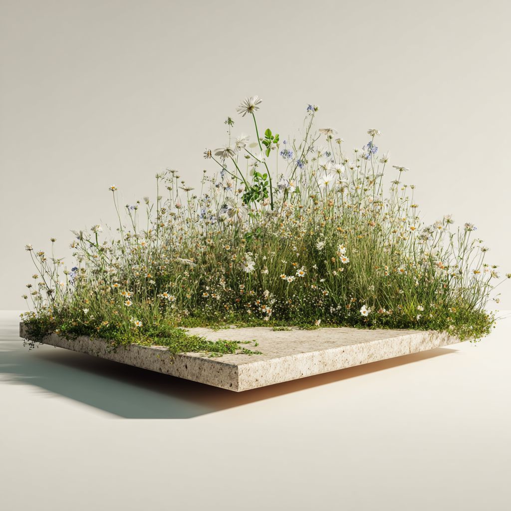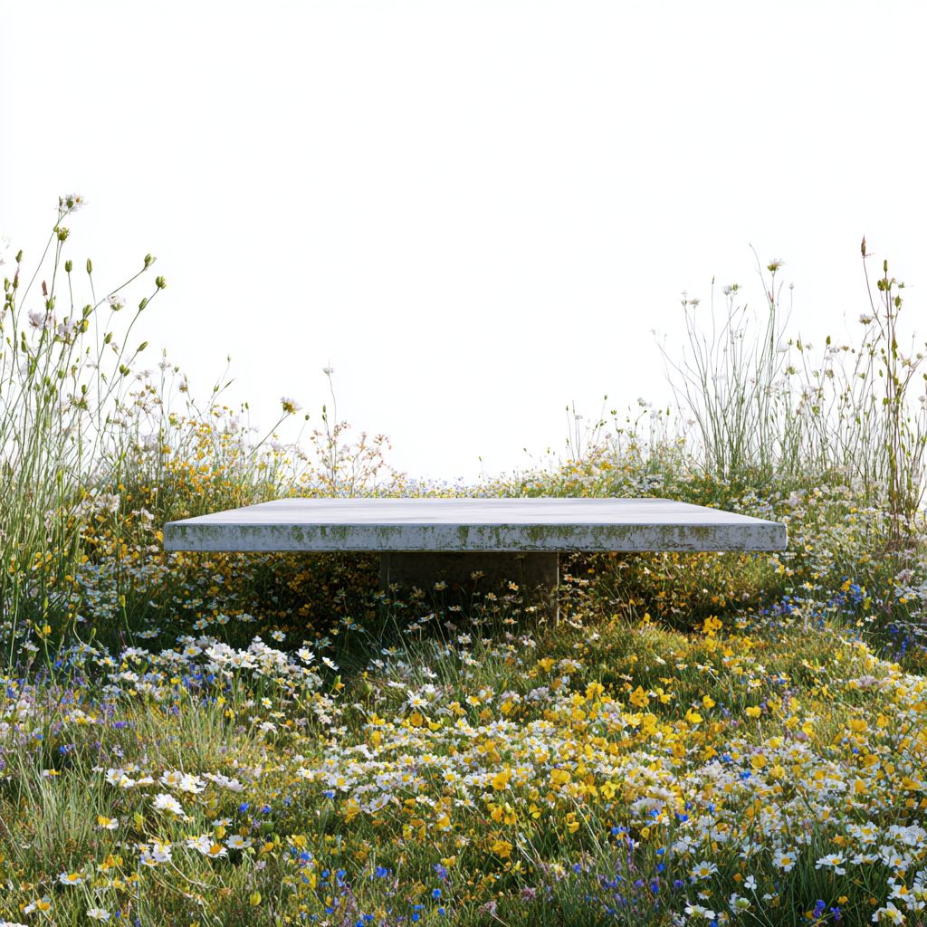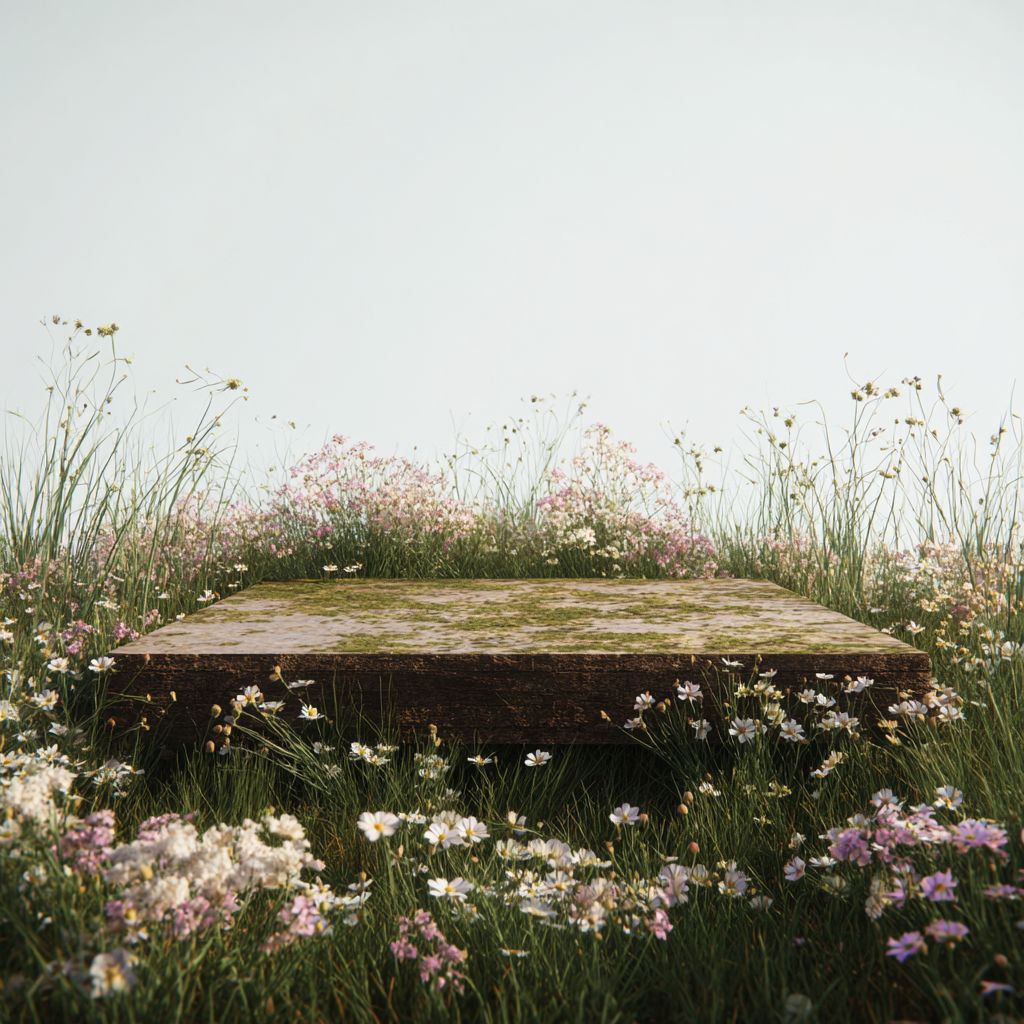 A low angle cinematic shot of a grass and wildflower covered platform against a white background