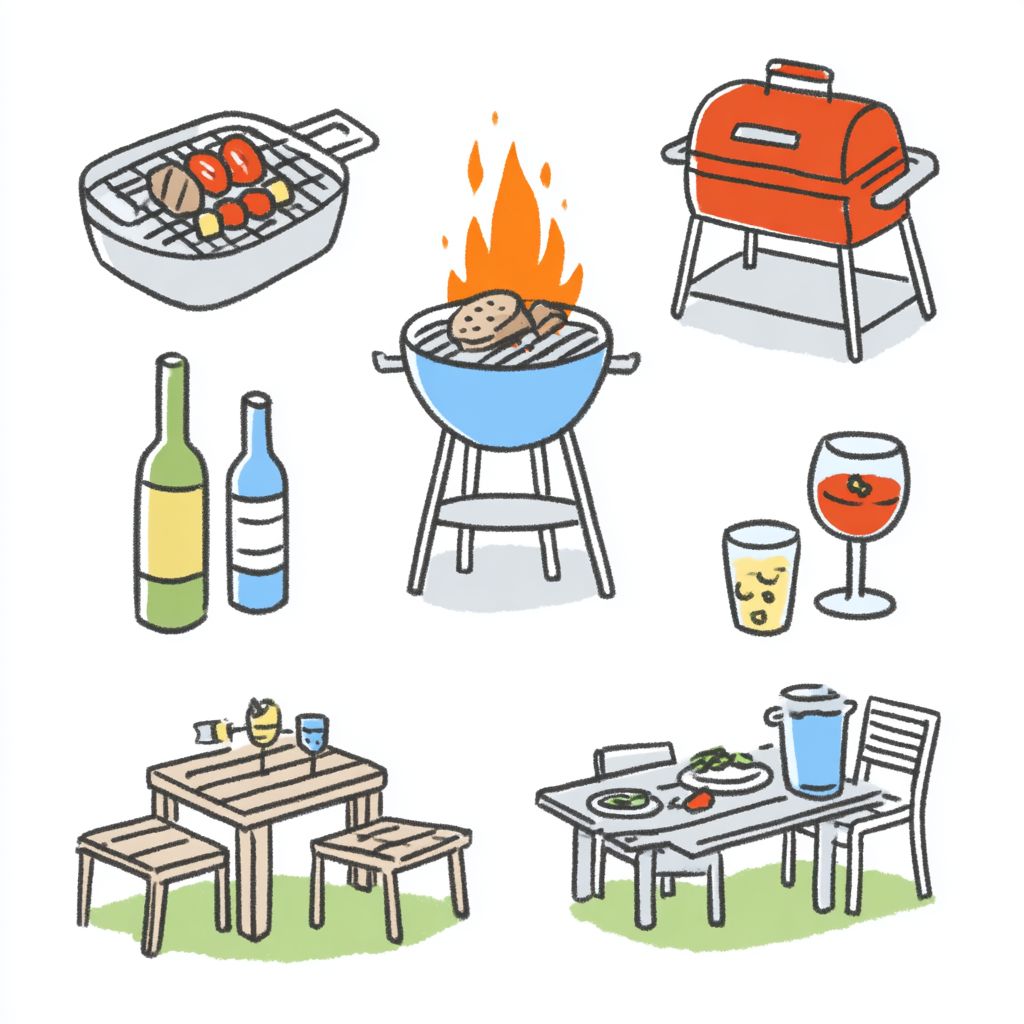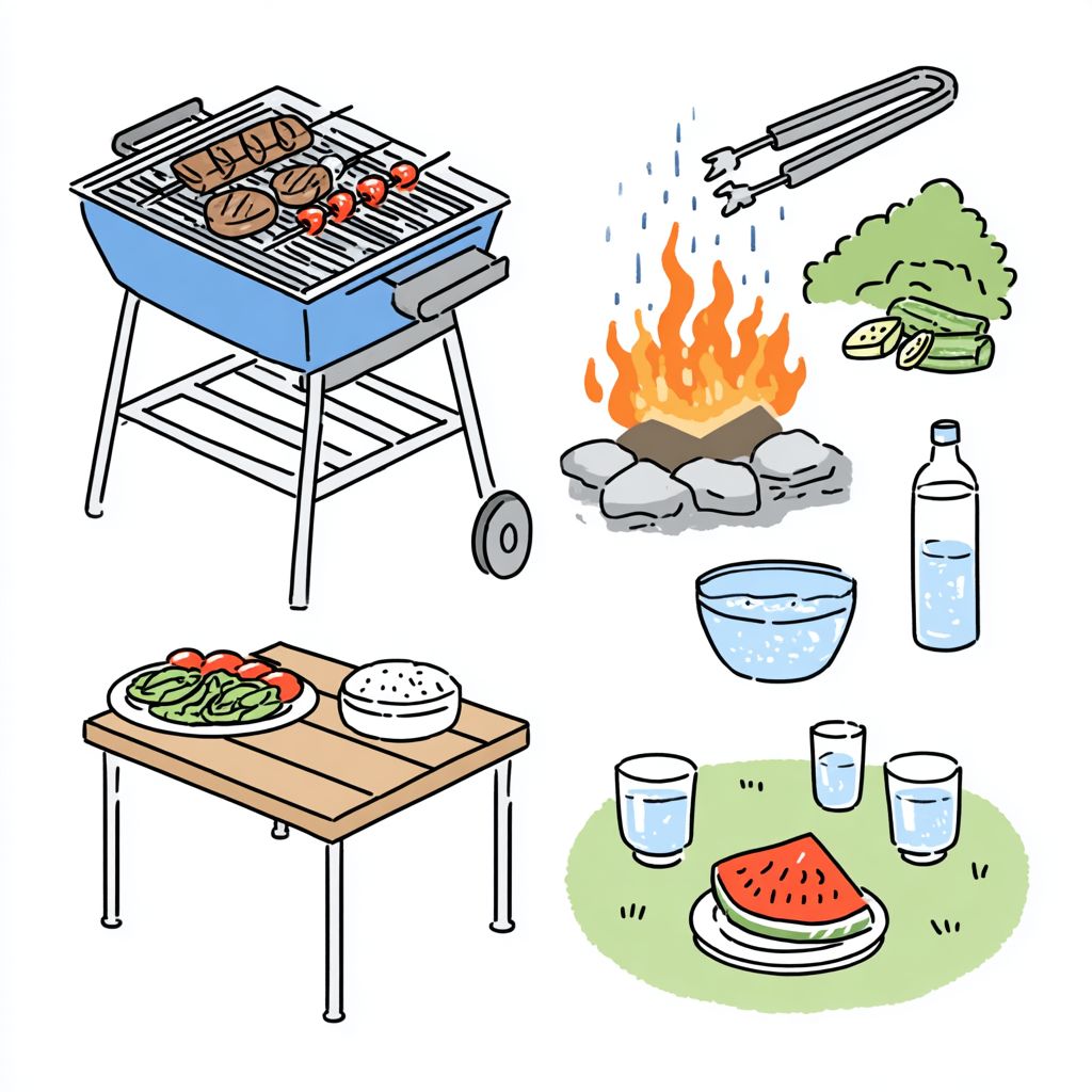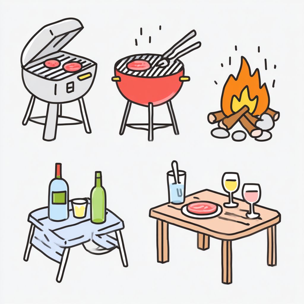 A set of BBQ-themed illustrations, including a barbecue grill with fire, skewered meat and vegetables, tongs, picnic table, drinks, plates, cheerful and lively atmosphere, colorful but simple design, anime illustration style, vector icon style, highly detailed, white background.