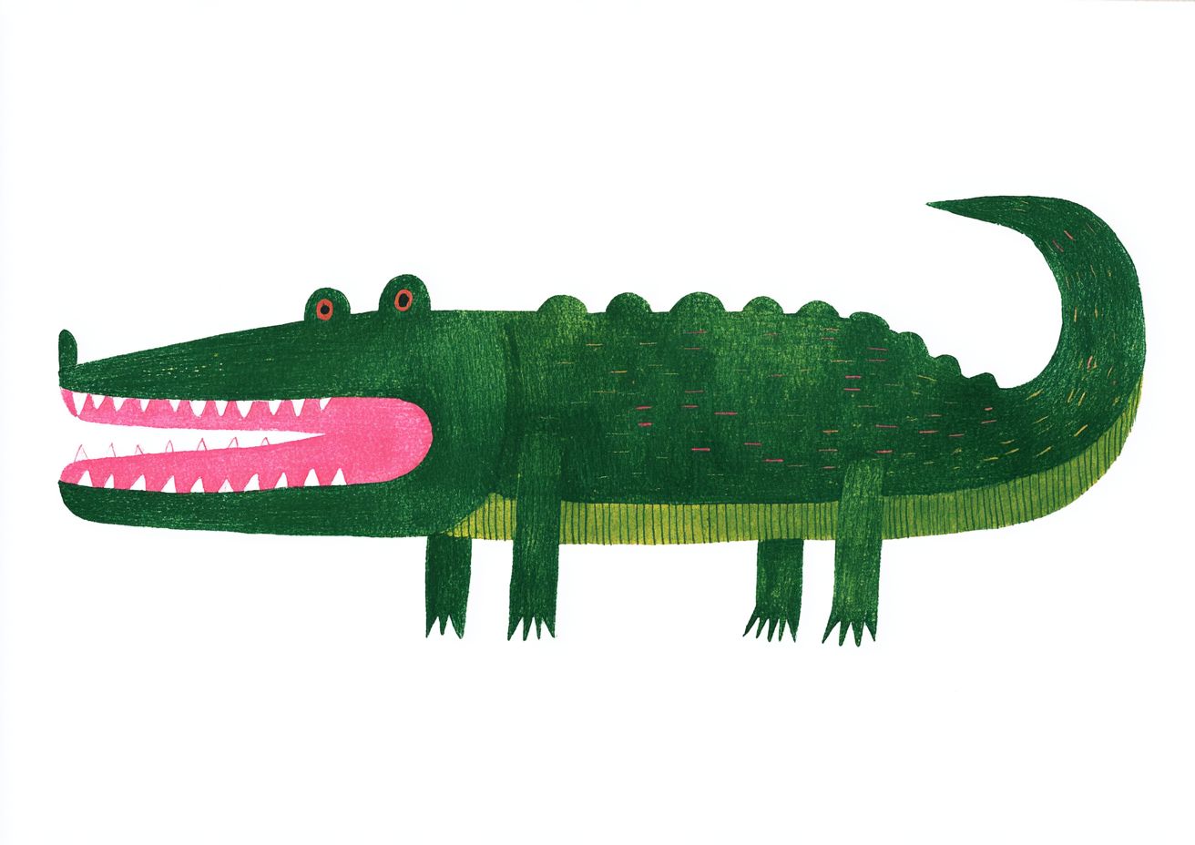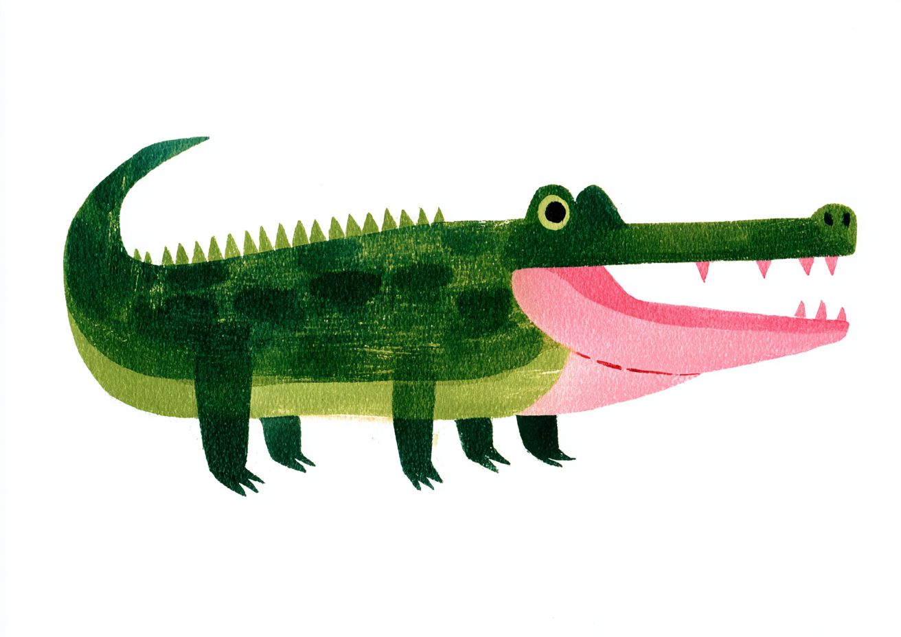 a green crocodile with pink teeth, simple shapes in the style of henri matisse and ryo takemasa, gouache on paper, white background, simple children's book illustration style, simple, cute, full body. --ar 128:91