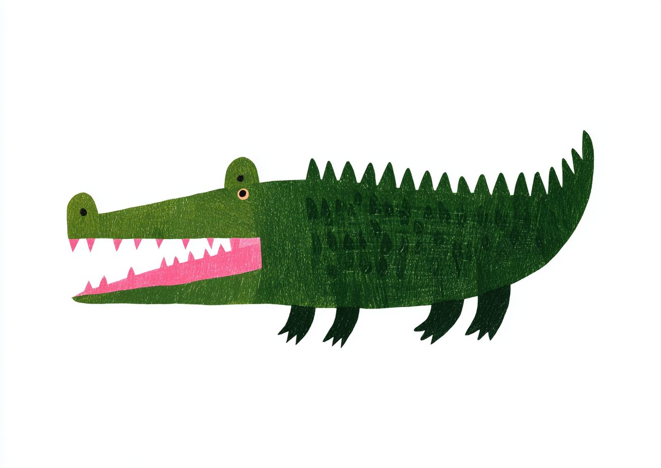 A green crocodile with pink teeth, simple shapes in the style of Henri Matisse and Ryo Takemasa, gouache on paper, white background, simple children's book illustration style, simple, cute, full body.