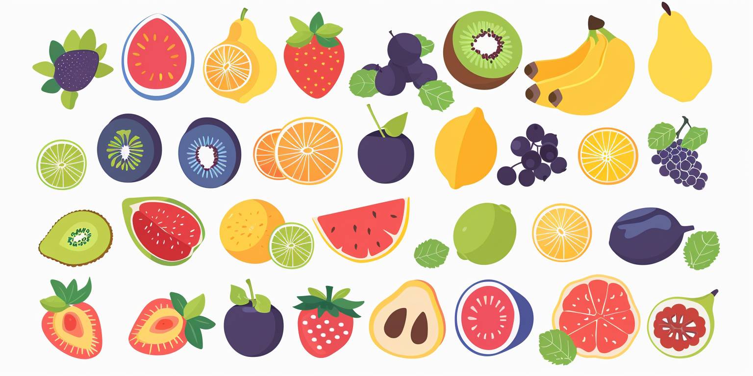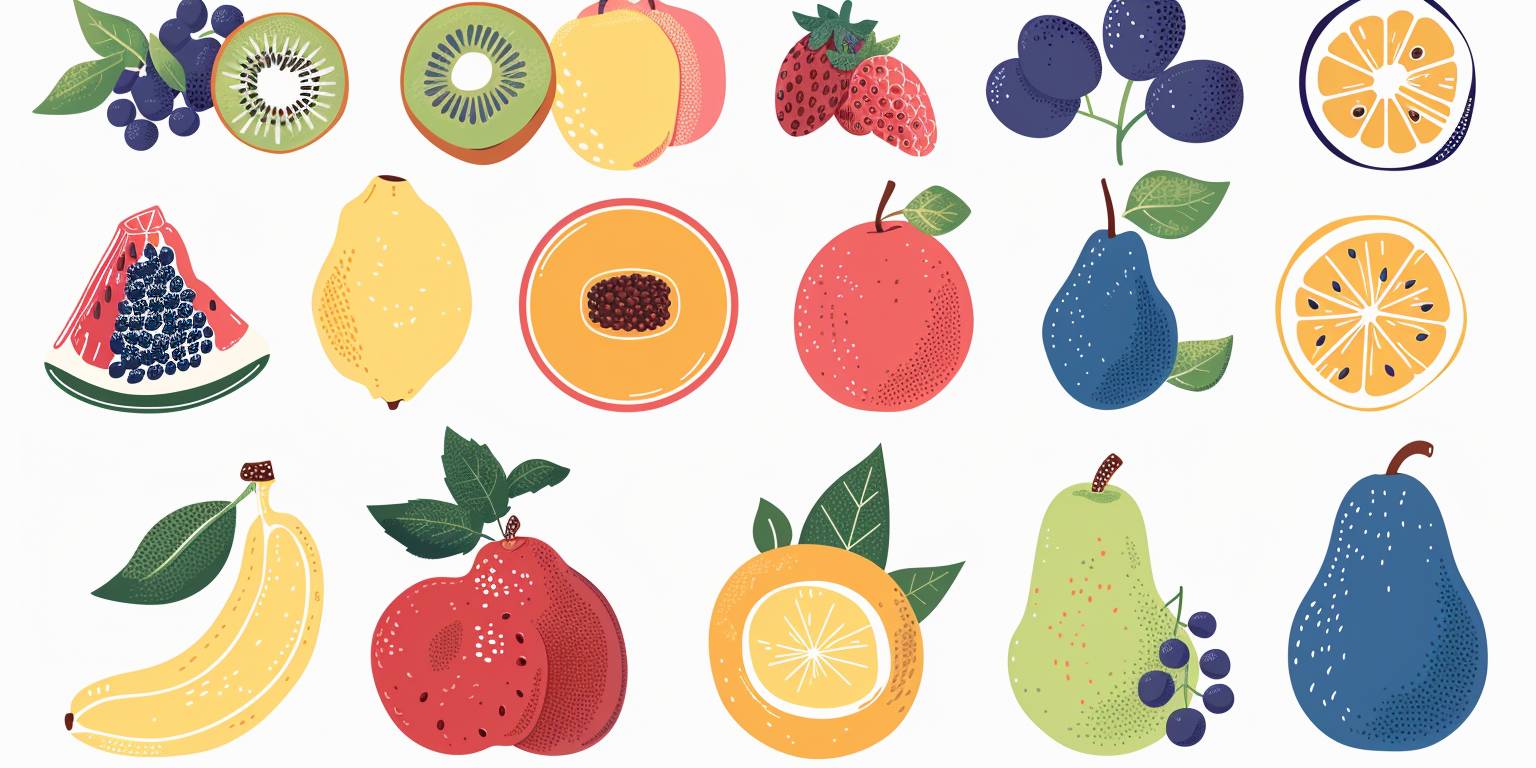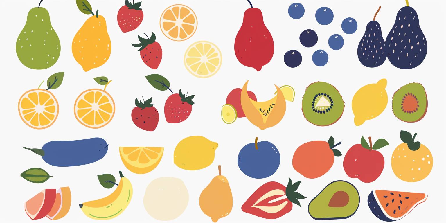 vector graphic of various fruit, white background with blue highlights, simple flat design, no shadows, vector art style, simple shapes, no gradients, simple color scheme, --ar 2:1 --v 6.0