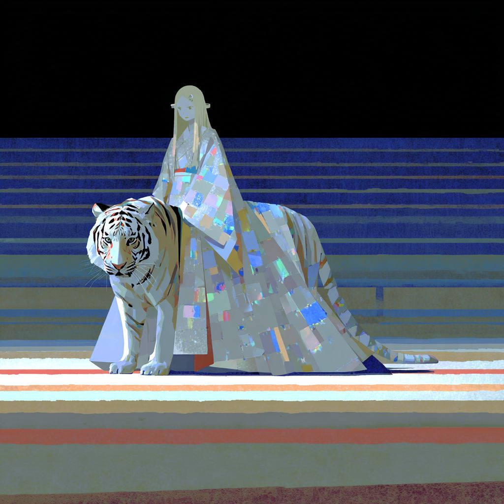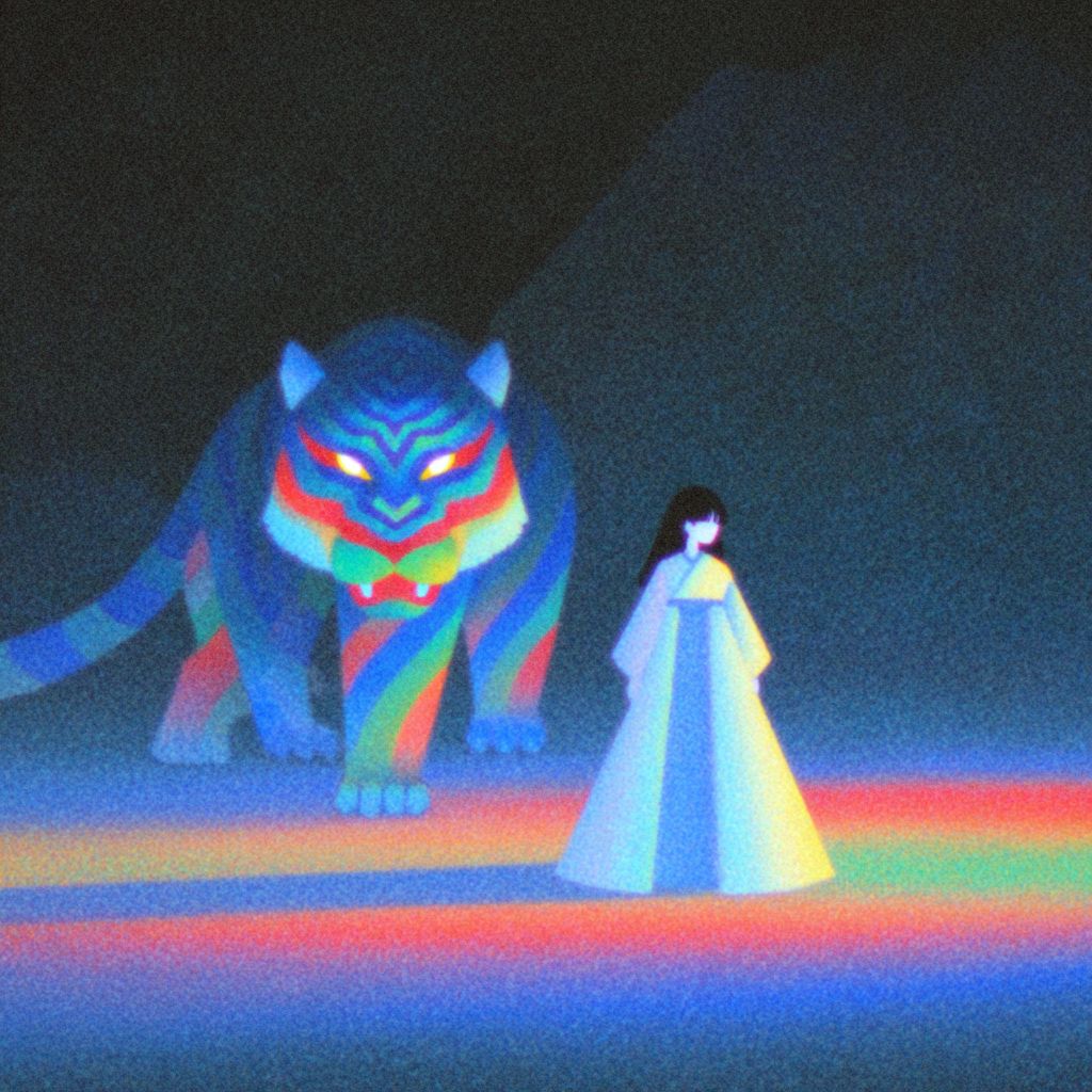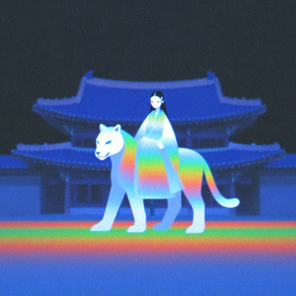 A surreal, high-fashion Vogue-style editorial illustration of a Korean woman in a flowing, avant-garde hanbok, riding a majestic tiger in front of Gyeongbokgung Palace. The composition blends the elegance of traditional Korean motifs with the experimental flair of Jacquemus runway art direction. The hanbok is adorned with intricate mother-of-pearl (najeon) patterns that shimmer with iridescent gradients, contrasting with bold, oversized modern silhouettes. The tiger is depicted as both fierce and regal, with abstract, graphic stylization reminiscent of vintage Japanese magazine covers. The background emphasizes the grandeur of Gyeongbokgung’s tiled rooftops and stone architecture, portrayed in minimal yet powerful poster abstraction. Strong contrasts of soft pastel tones with vivid reds, blacks, and golds create a dramatic, editorial mood. The overall atmosphere feels like a surreal luxury ad campaign--experimental, iconic, and culturally rich, with an impactful visual narrative that bridges tradition and modernity. chaos s --chaos 66 --ar 1:1 --exp 75 --sref 3993341444 4199451656 3723876344 --profile 5znr923