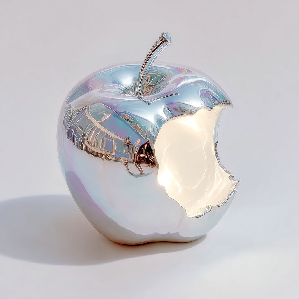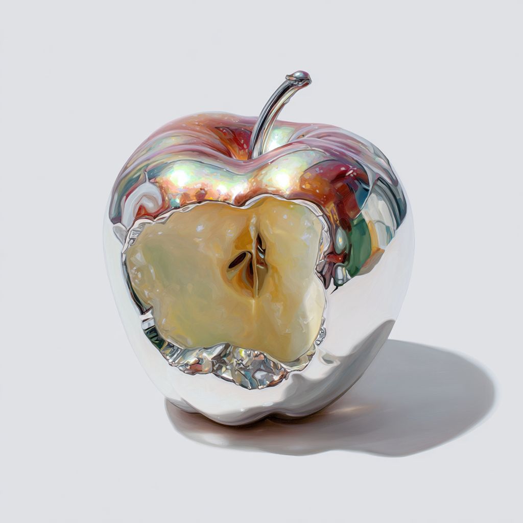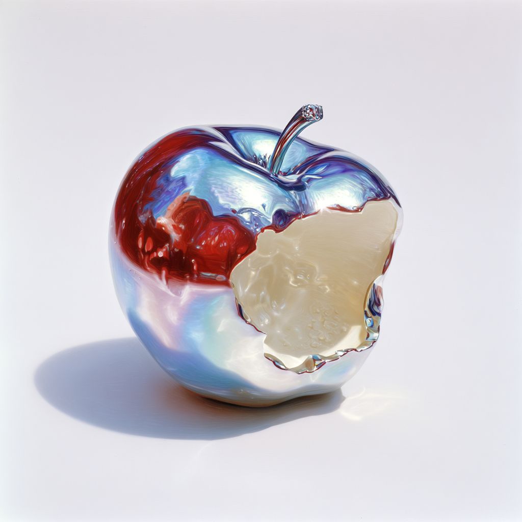 An airbrushed image of a delicious, chrome looking apple with a big bite taken out of it. Painted in the ephemeral style of Hajime Sorayama and Masao Saito. The apple is softly lit and almost glowing phosphorescent and is set on a clean white background.