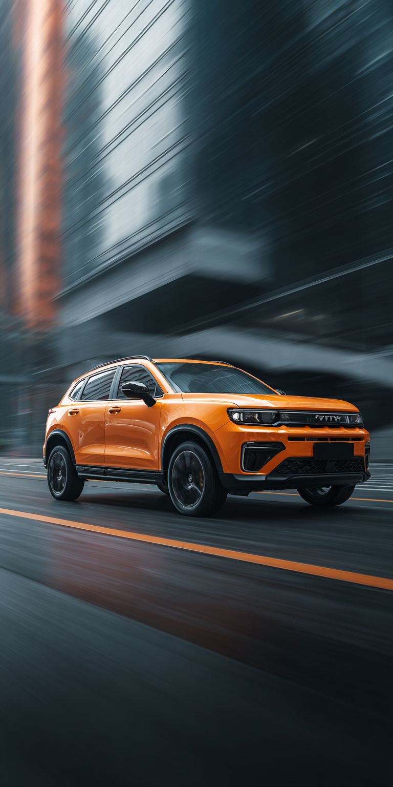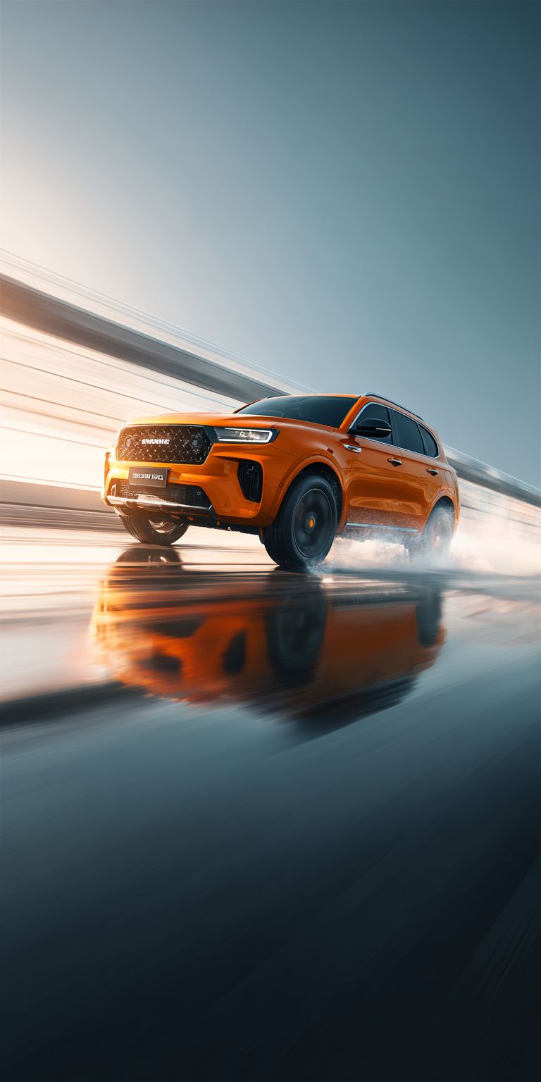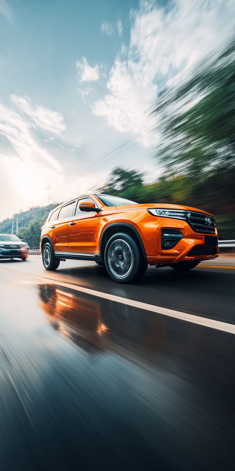 Ultra realistic photo of a Orange GWM Tank 300 car driving at high speed, natural light and realistic shadows, detailed reflections on the glossy body, motion blur on wheels and road, clean white background, sharp focus on the car, premium automotive photography style --ar 1:2 --v 7.0