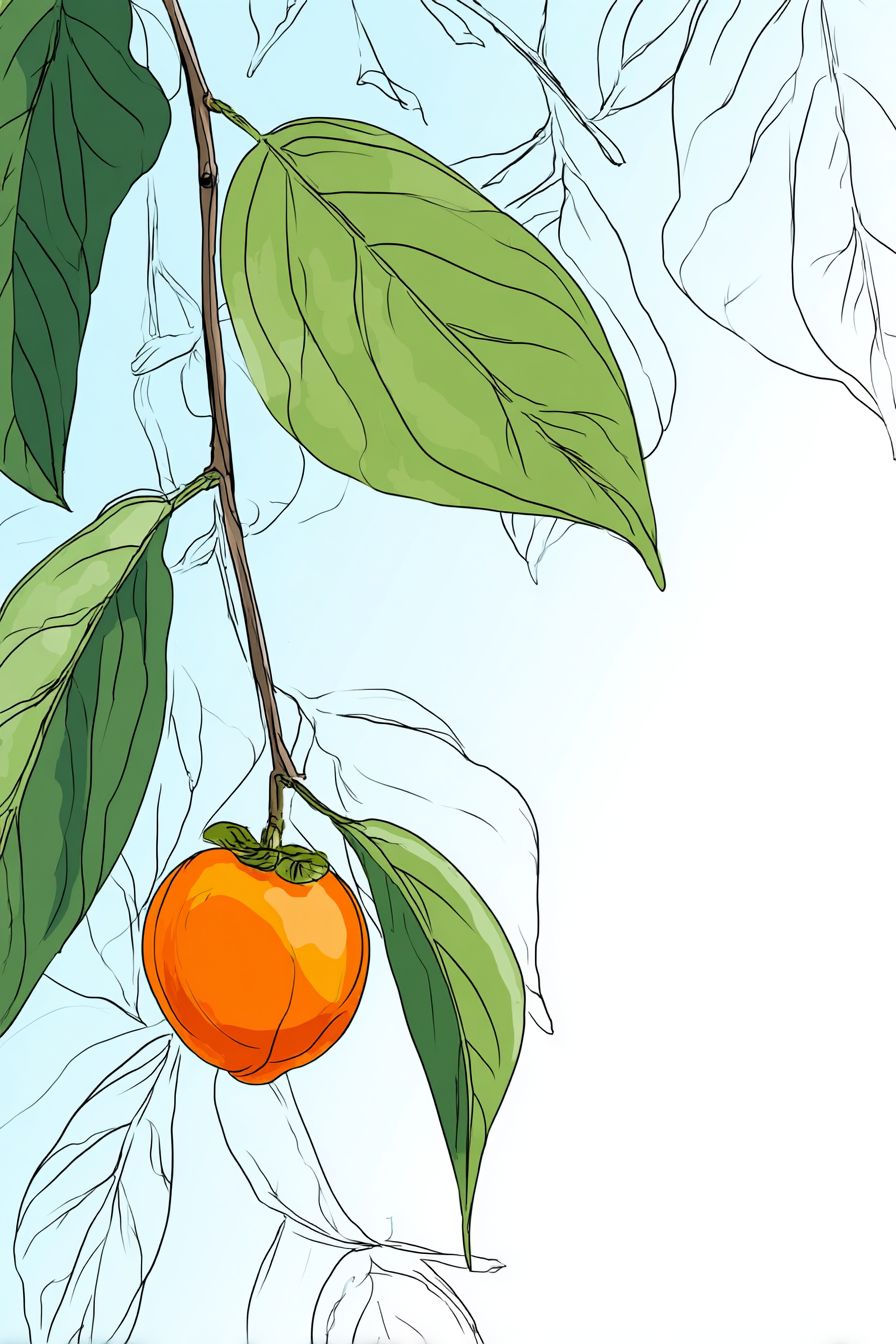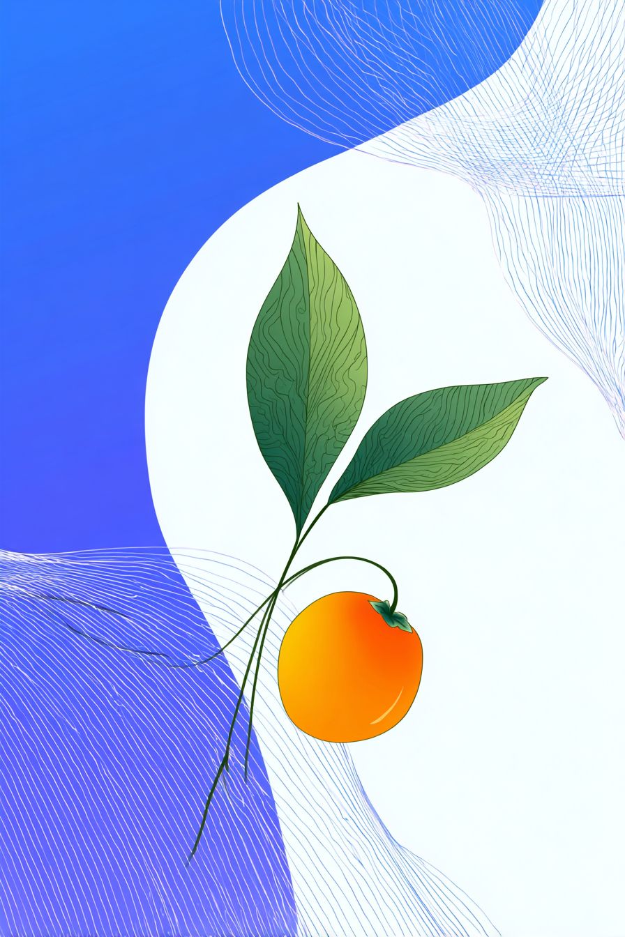 Blank background with ample white space, simple black lines, a green leaf and an orange glass little persimmon, minimalist style, softly outlined lines, no shadows or textures, high contrast color scheme, centered composition, colorful, with a royal blue gradient background and a frosted glossy effect. --ar 2:3 --v 7.0