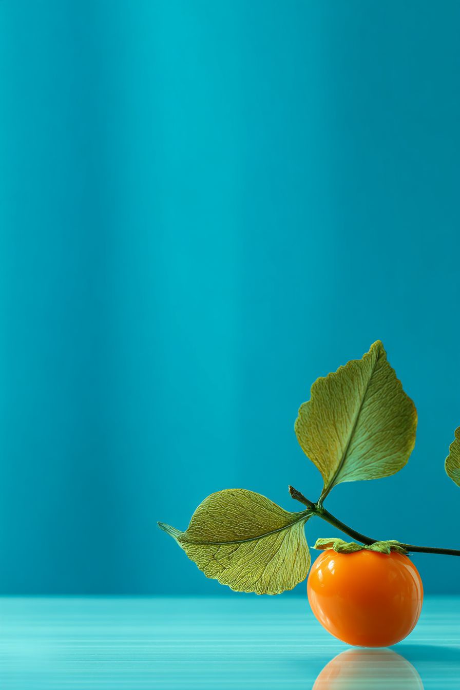 Minimalist background design featuring a green leaf and an orange little persimmon