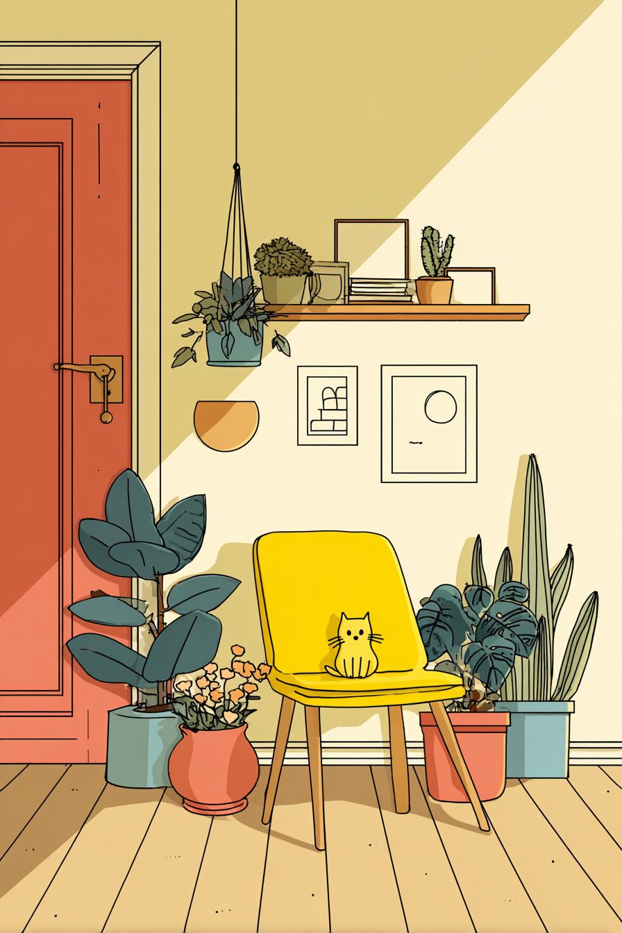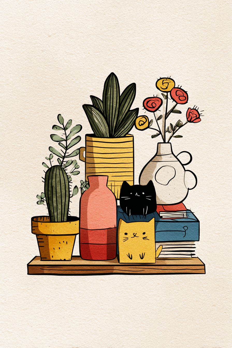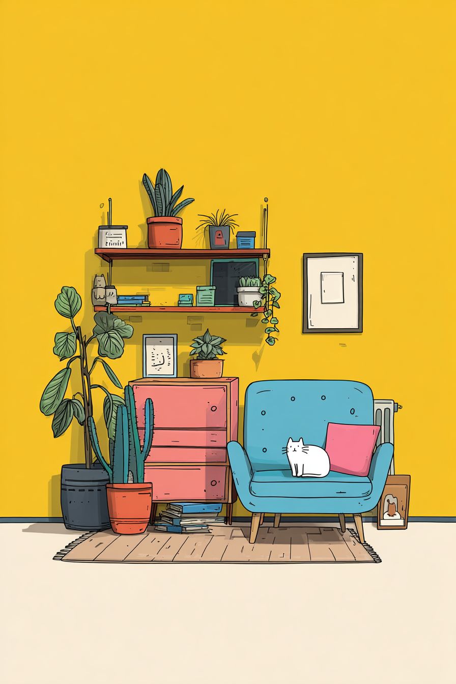 Hand-drawn cartoon illustration with a minimalist home decor. The overall composition is simple, filled with a lively, friendly, and playful atmosphere. --ar 2:3 --v 7.0