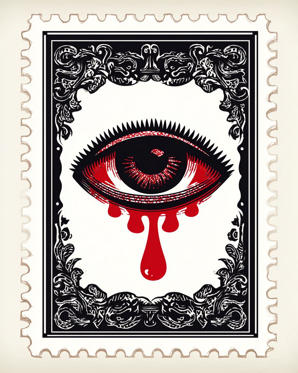 a single vintage postage stamp featuring an eye with red tears, isolated on a white background. the detailed illustrated design is in the style of john stead and james jean, centered in the middle of the page with no border. --chaos 10 --ar 51:64 --raw --profile a6lurwu --stylize 0 --v 7.0