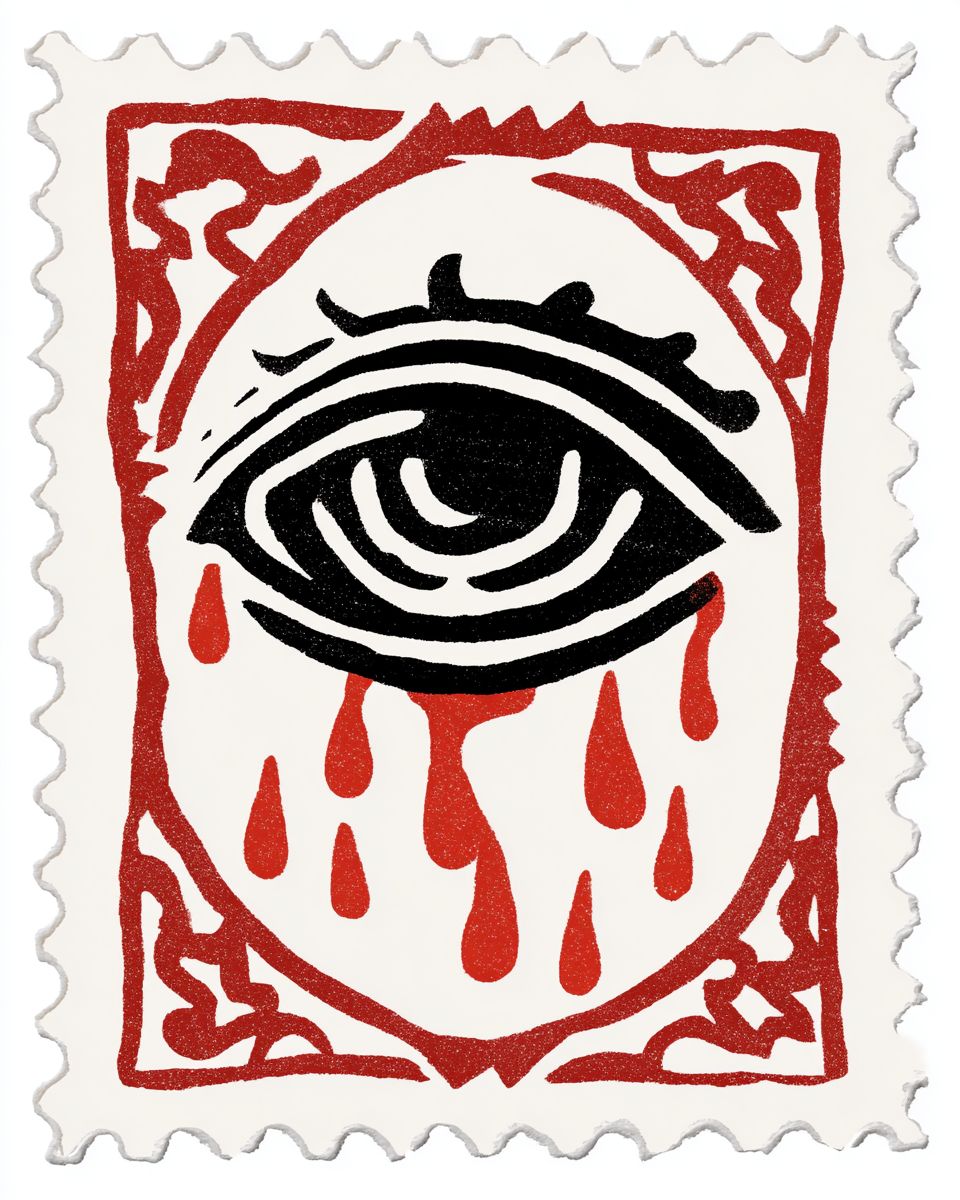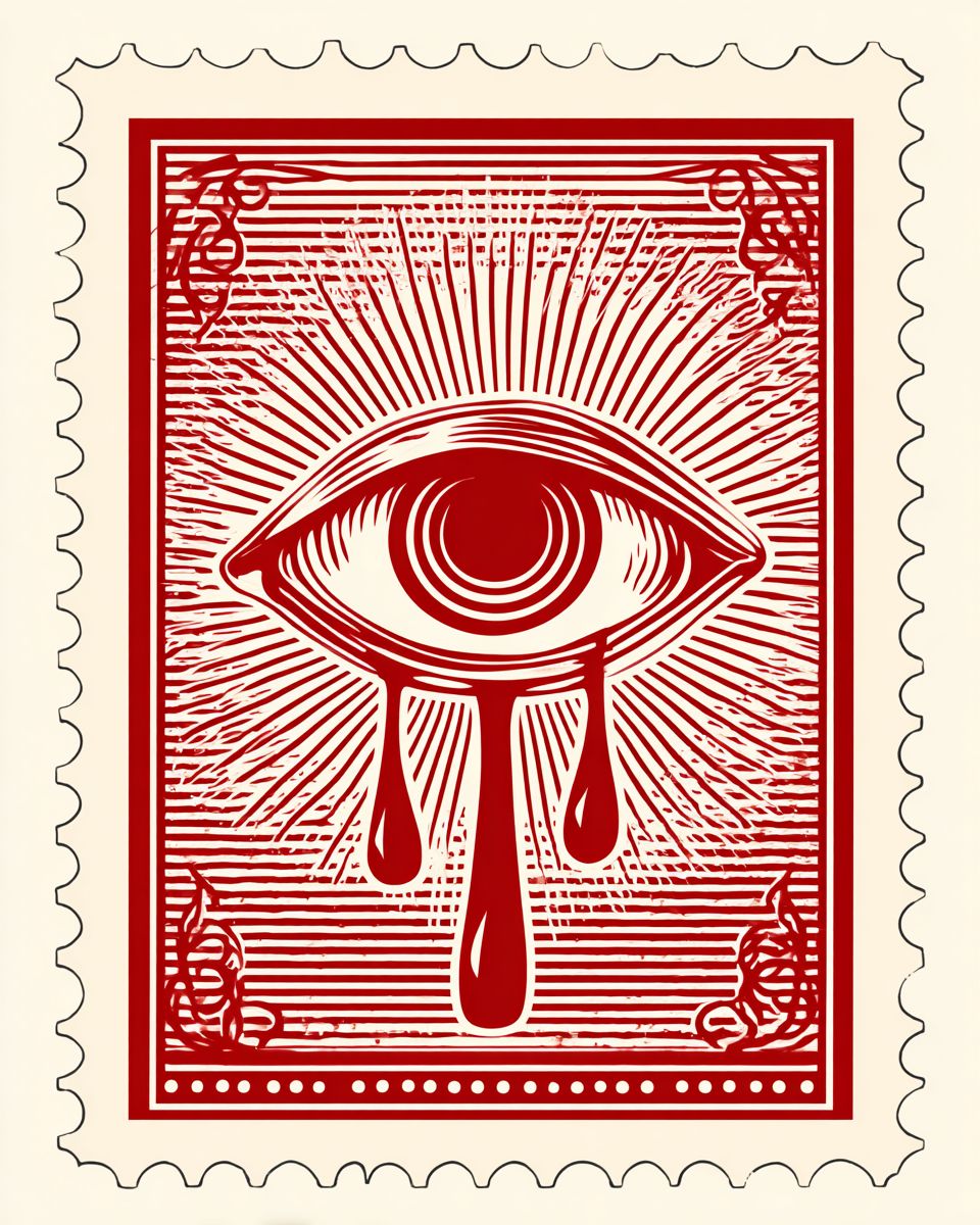 A single vintage postage stamp featuring an eye with red tears, isolated on a white background. The detailed illustrated design is in the style of John Stead and James Jean, centered in the middle of the page with no border.