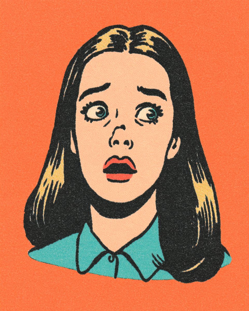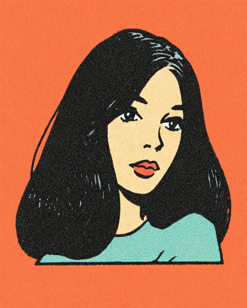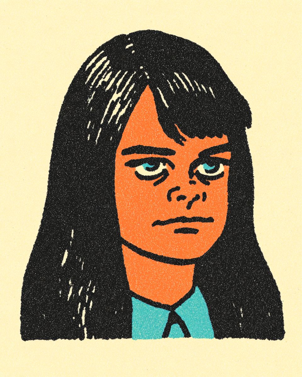 A head-and-shoulders portrait of a casually-dressed pale sardonic woman with long straight ash brown hair and a square flat wide chin who looks weirded out.