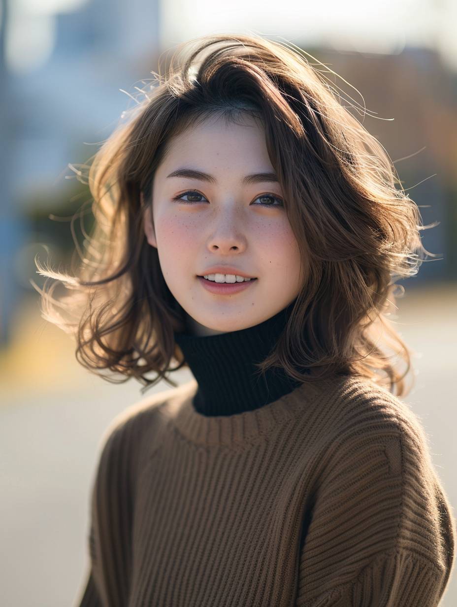 Cute Japanese fashion model, 18 years old, medium beige-brown hair, simple and elegant clothes, soft light, high quality, SLR. Embarrassed grin.