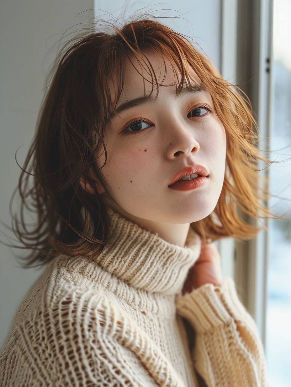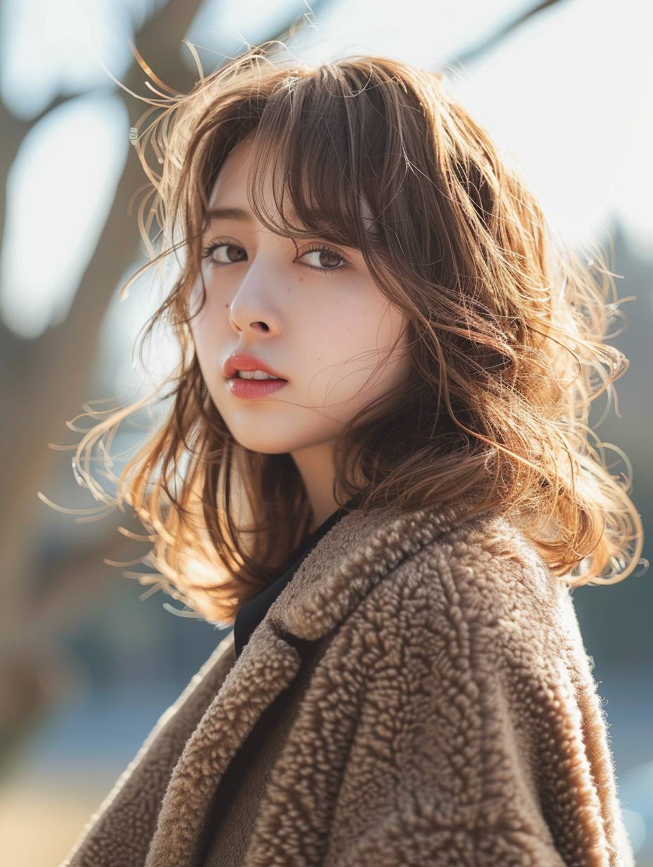 Cute Japanese fashion model, 18 years old, medium beige-brown hair, simple and elegance clothes, soft light, high quality, SLR. embarrassed grin. --ar 3:4 --v 6.0
