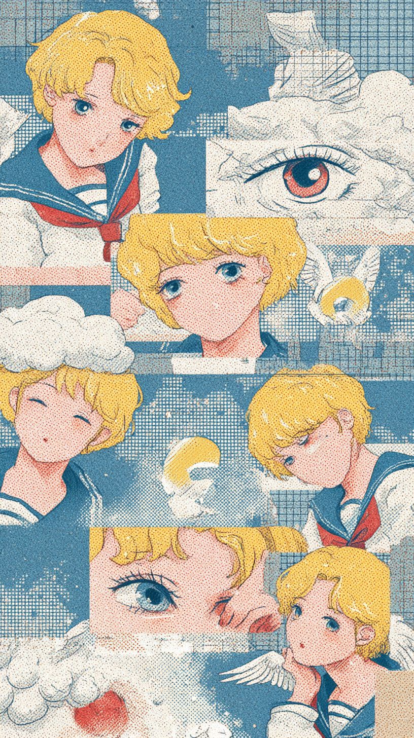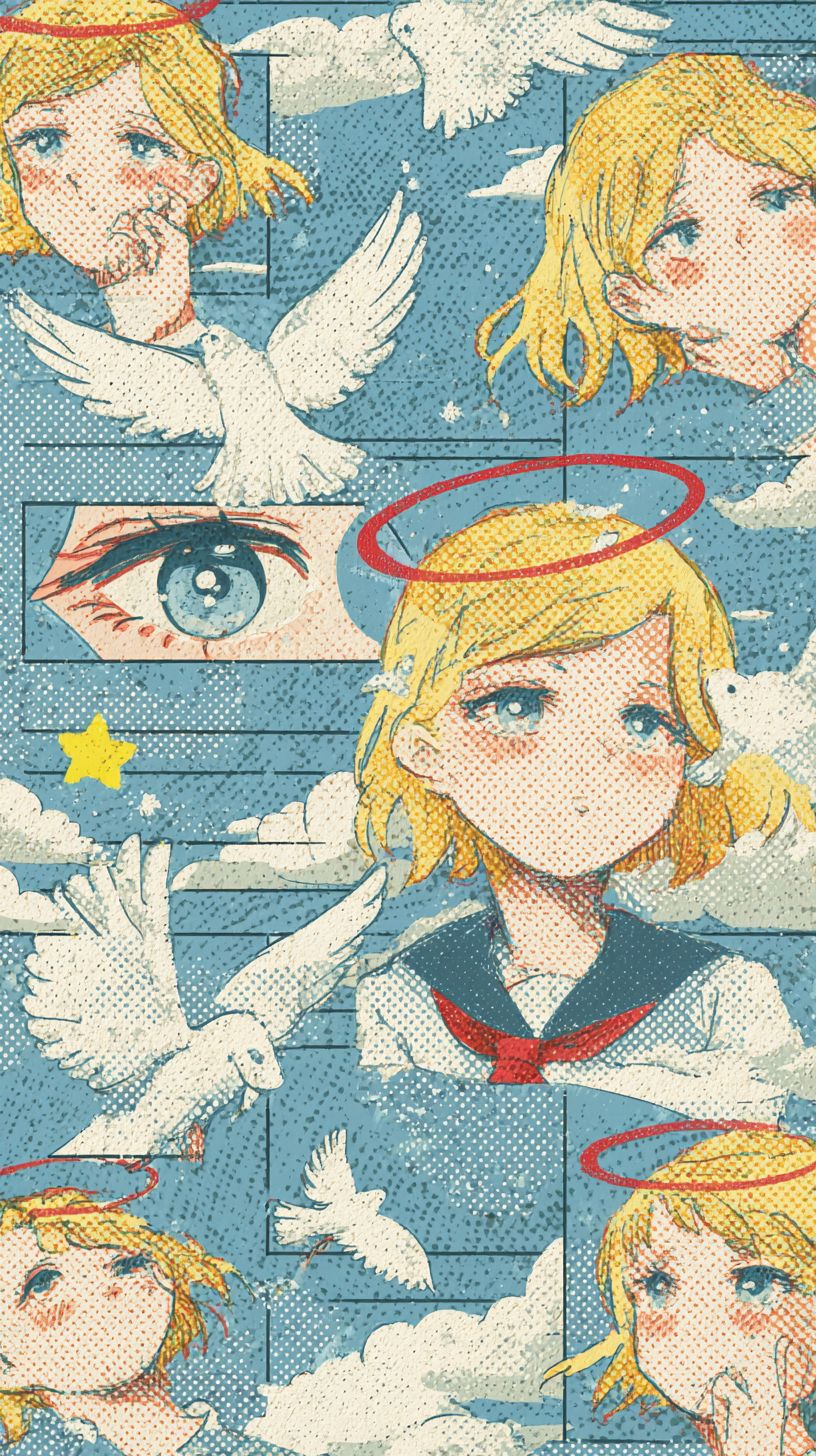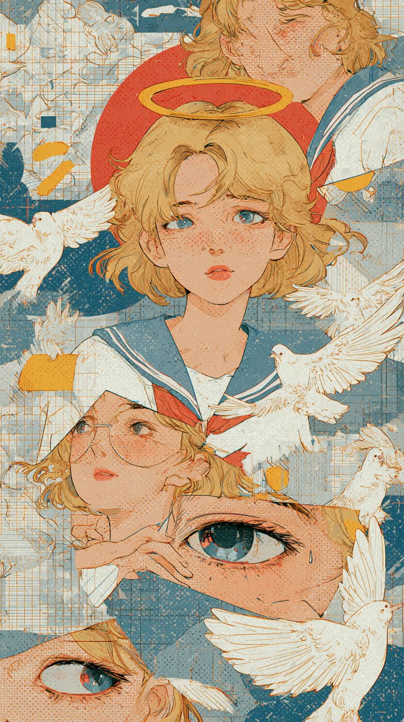 9:16, digital illustration, manga sticker collage style, textured blue background with dot and grid patterns, central blonde girl in a sailor school uniform with red painterly halo and angel wings, repeated in overlapping comic panels, multiple cute expressions (sleeping, calm, thoughtful), surrounded by flying white doves, pixel art question mark, yellow outline star, close-up eye with sky clouds reflections, playful cutout arrangement, generous negative space, not crowded. Clean textured lineart, pastel colors, soft grain, matte powdery surfaces, no harsh shine, soft-colored outlines with faint white borders, gentle dot tones for shading. Color palette: gentle blues, creams, soft yellow, powder pink, red accents. Vintage manga screentone, VSCO pastel filter, low contrast, matte look, faded shadows, analog grain. Dreamy, gentle, nostalgic, cartoonish, neo-retro shoujo pop art, soft airbrush effect, Instagram editorial mood --ar 9:16 --raw --v 7.0