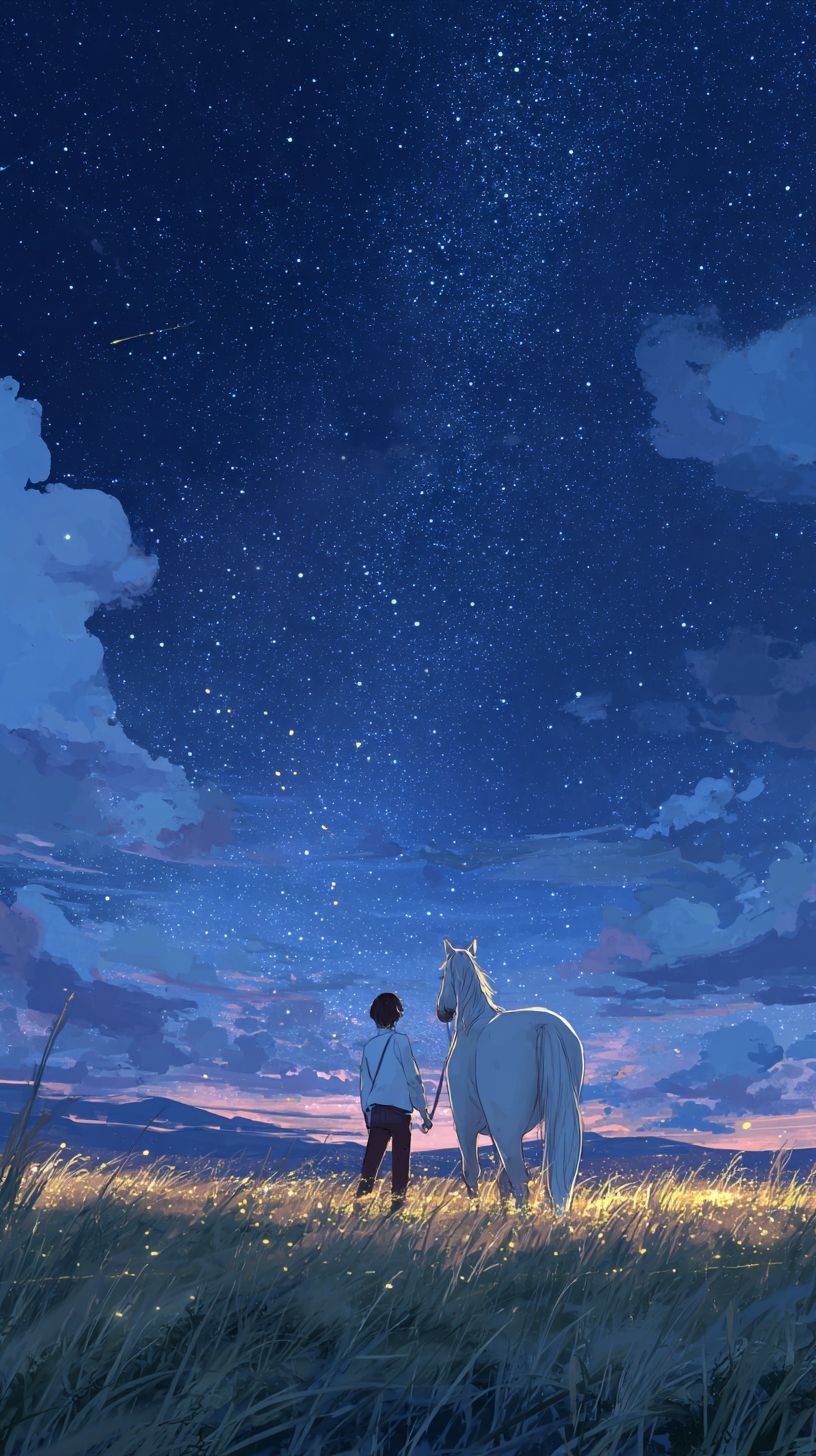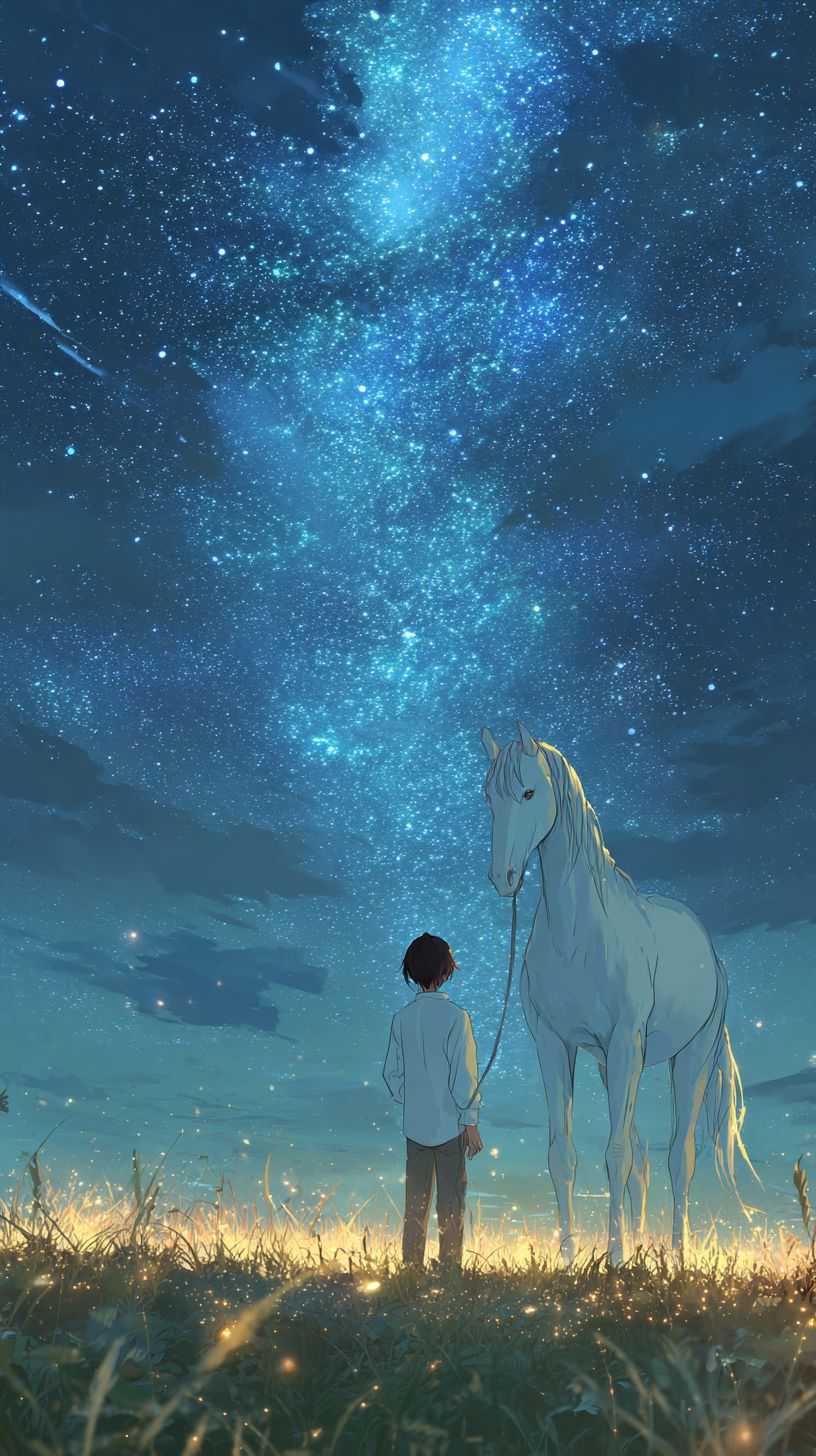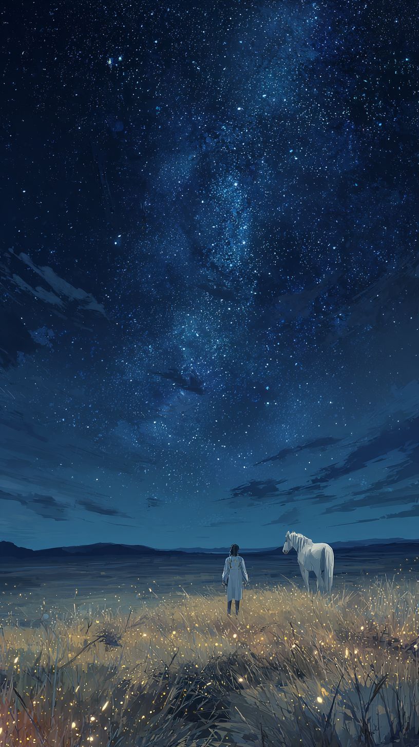On the vast grassland, under the starry sky, a young man in white faces a white horse