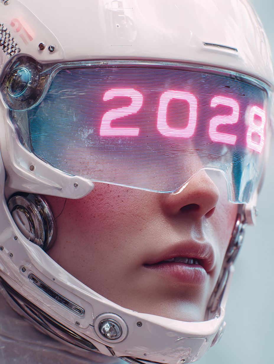 Close-up portrait of a futuristic female cyborg in a glossy pearl white helmet with chrome details, glowing softly. The visor projects '2026' in neon pink, with the HUD interface in pastel cyan and lavender. The face is hyper-realistic, with finely detailed skin showing natural pores, and cinematic depth of field. Pastel cyberpunk, dreamy futuristic atmosphere.