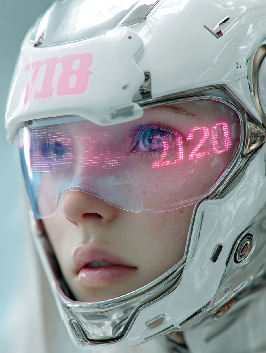 Close-up portrait of a futuristic female cyborg in glossy pearl white helmet with chrome details, glowing softly. Visor projects "2026" in neon pink, HUD interface in pastel cyan and lavender. Face hyper-realistic, skin finely detailed with natural pores, cinematic depth of field. Pastel cyberpunk, dreamy futuristic atmosphere. --ar 3:4 --v 7.0