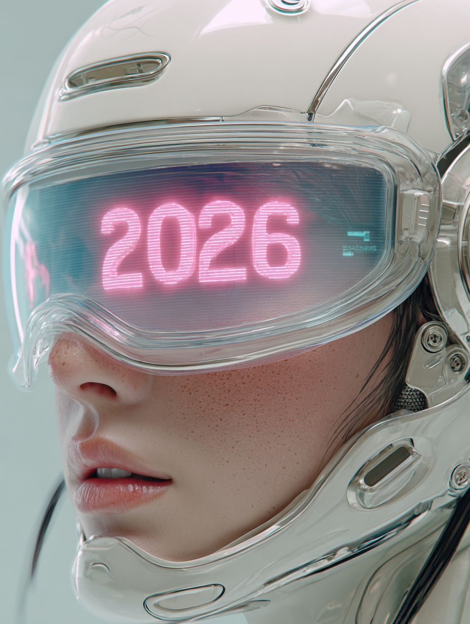 Close-up portrait of a futuristic female cyborg with a glossy pearl white helmet featuring chrome details and projecting '2026' in neon pink