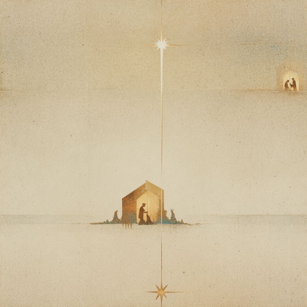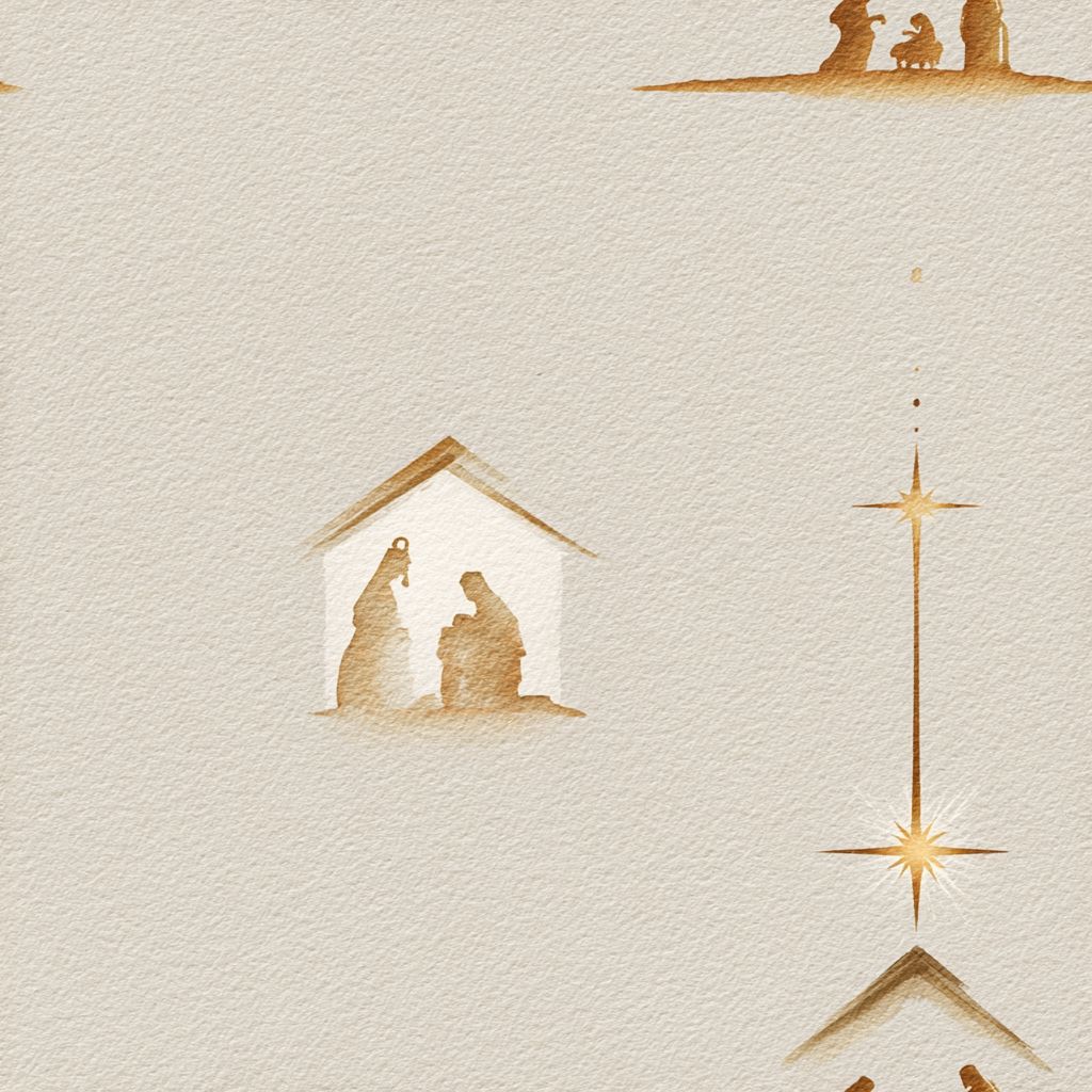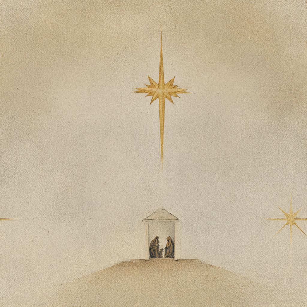 Minimalist devotional sacred art, Star of Bethlehem as a small crisp eight-point star at top center, the brightest and clearest element; a single slender vertical pale-gold ray descends directly to a simple humble doorway suggesting the house; within the doorway a simplified Mary silhouette holds the Child, both with thin understated halos; two or three Magi kneel in quiet adoration, small silhouettes, humble gestures, all sacred figures together only 20-25% of canvas amid wide ivory negative space; background clean ivory with faint warm sand near the base and a subtle indigo wash toward the top; restrained palette of ivory, pale gold, muted ochre, warm sand, sage, indigo; symbols flat and softly glowing, no ornate detail, no monumental architecture, no decorative frames; mood of adoration, awe, humility, thanksgiving; print-safe margins, subtle paper grain texture, minimal gradients, no photorealism, no text, no borders --tile --v 7.0